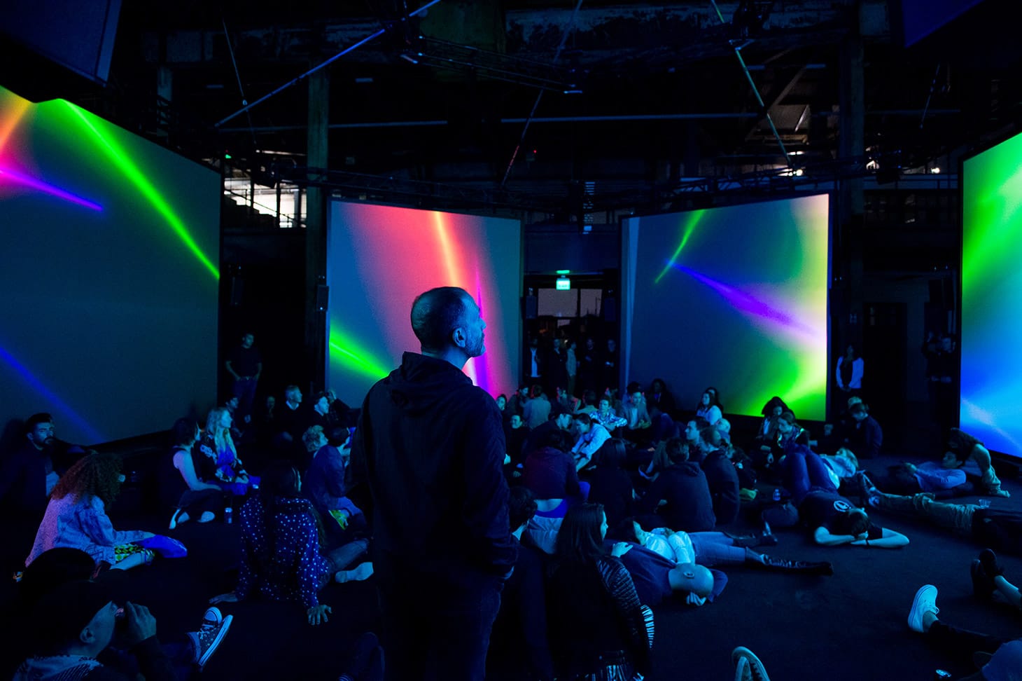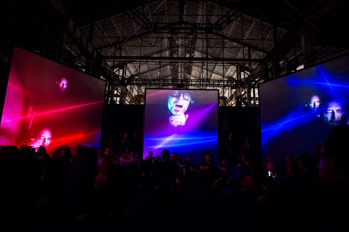 The other signature performances at Gray Area Festival took place in the ISM Hexadome, a multimedia environment with a state of the art sound system and six towering screens that encircle its audience. Most pieces, designed by collaborative musician and visual artist pairs that included Thom Yorke and Tarik Barri, Lara Sarkissian and Jemma Woolmore, and Peter Van Hoesen and Heleen Blanken, played experimental music illustrated by abstract visuals. Like Inferno, the Hexadome’s immersive, 360-degree platform was an impressive technical achievement, but the compositions felt like mesmerizing, media-player audio visualizations on a grander scale.
