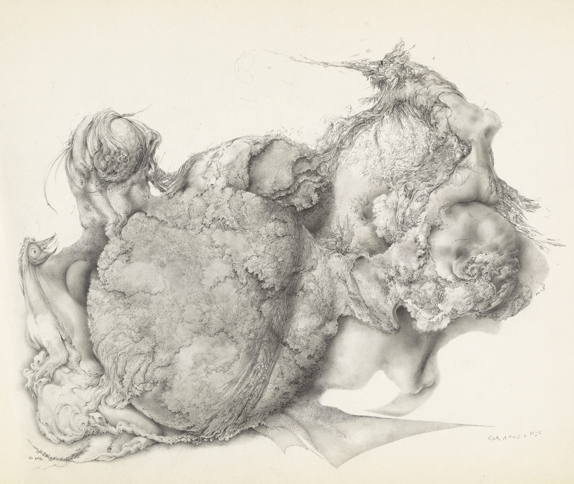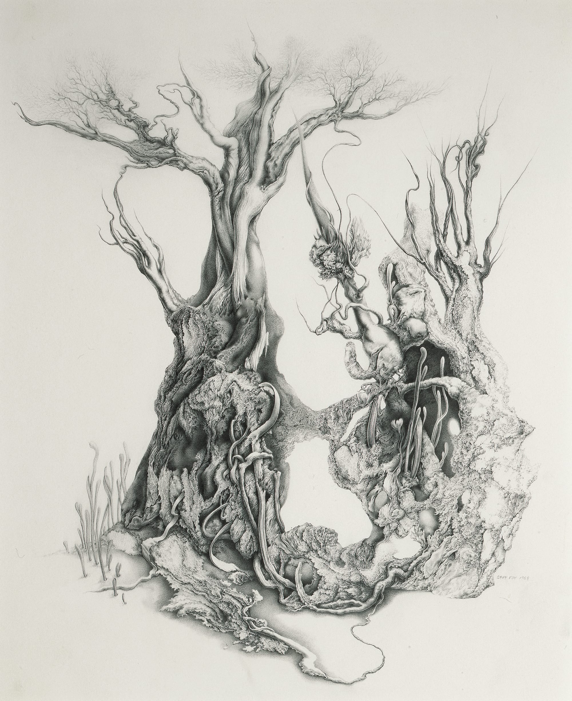 For all the inspiration Foy derived from the work of artists considered outré or eccentric — Dali, Tchelitchew, and Yves Tanguy — his use of graphite is unlike anyone else’s. His is a deeply personal approach that he continued to develop in the highly detailed, botanically inspired drawings he started in the 1950s. At the same time, I consider his drawings of the 1940s to be more than just well-done period pieces. What elevates Foy’s work from this decade — makes them more than stylistic oddities — is his painstaking merging of technique with a vision of decay and human pain.
