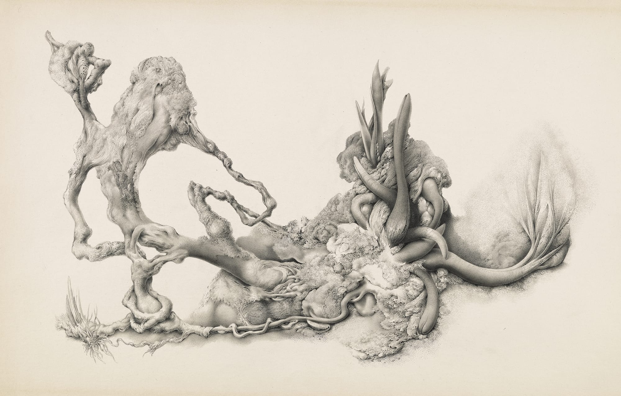 Whether working in a Surrealist mode or depicting botanical gatherings in which accuracy and fantasy merge, Foy’s meticulous consideration of minute textures of every imaginable kind is always manifesting itself in his work. Working with a sharp pencil, he can convey the smooth, porous surface of a stone, the filaments extending from a root, and the roughness of bark. When he stipples a surface, he seems to be doing it at the absolute of what can be achieved with a razor-sharpened point of graphite. This is exactitude raised to an almost microscopic level. His graphic intensity strikes me as a direct descendant of the linear perfection Albrecht Dürer attained in his copper plates. Every graphite mark that Foy made in a drawing, no matter how miniscule, was deliberate. At times, it is as if he is drawing with a mosquito’s stinger.