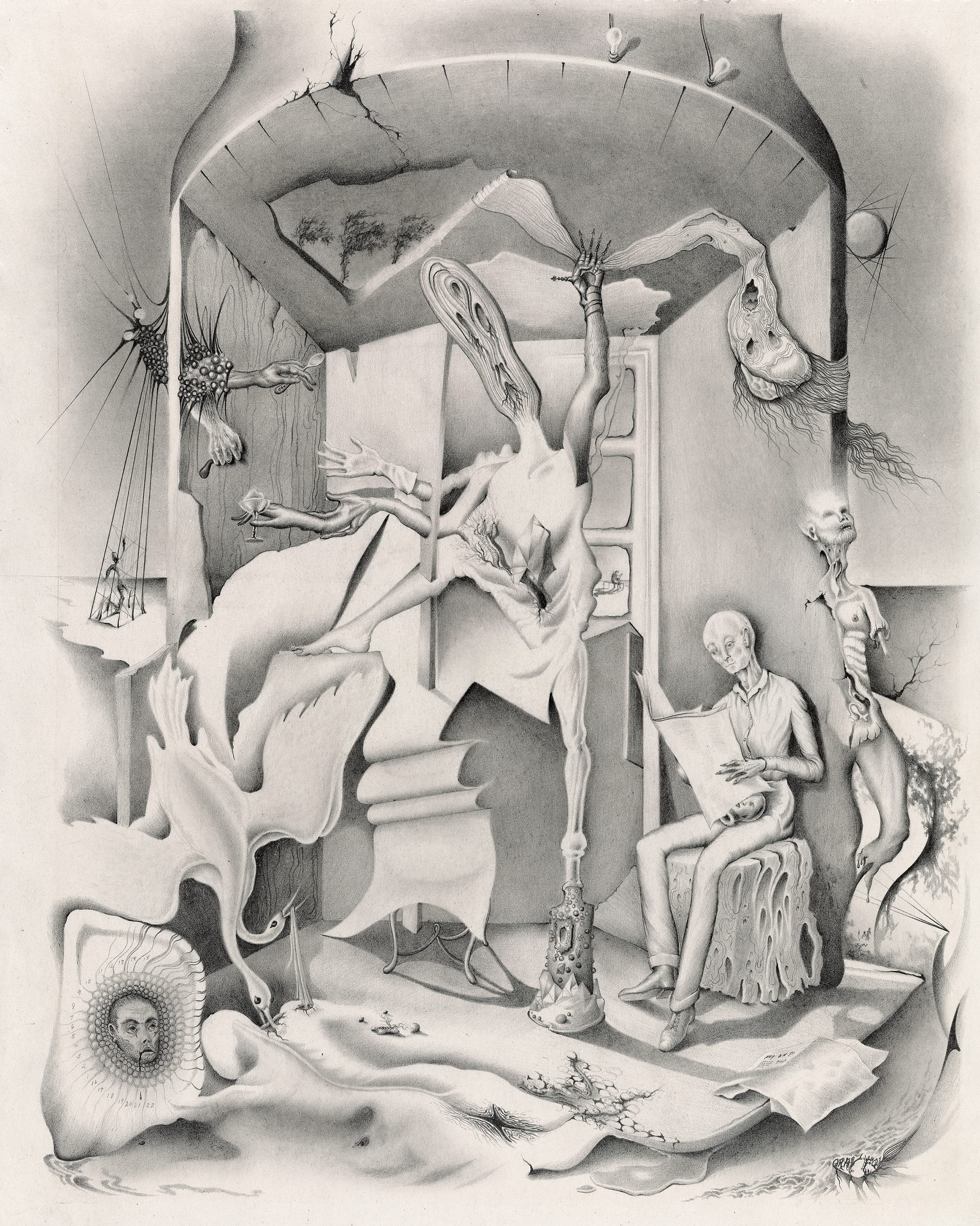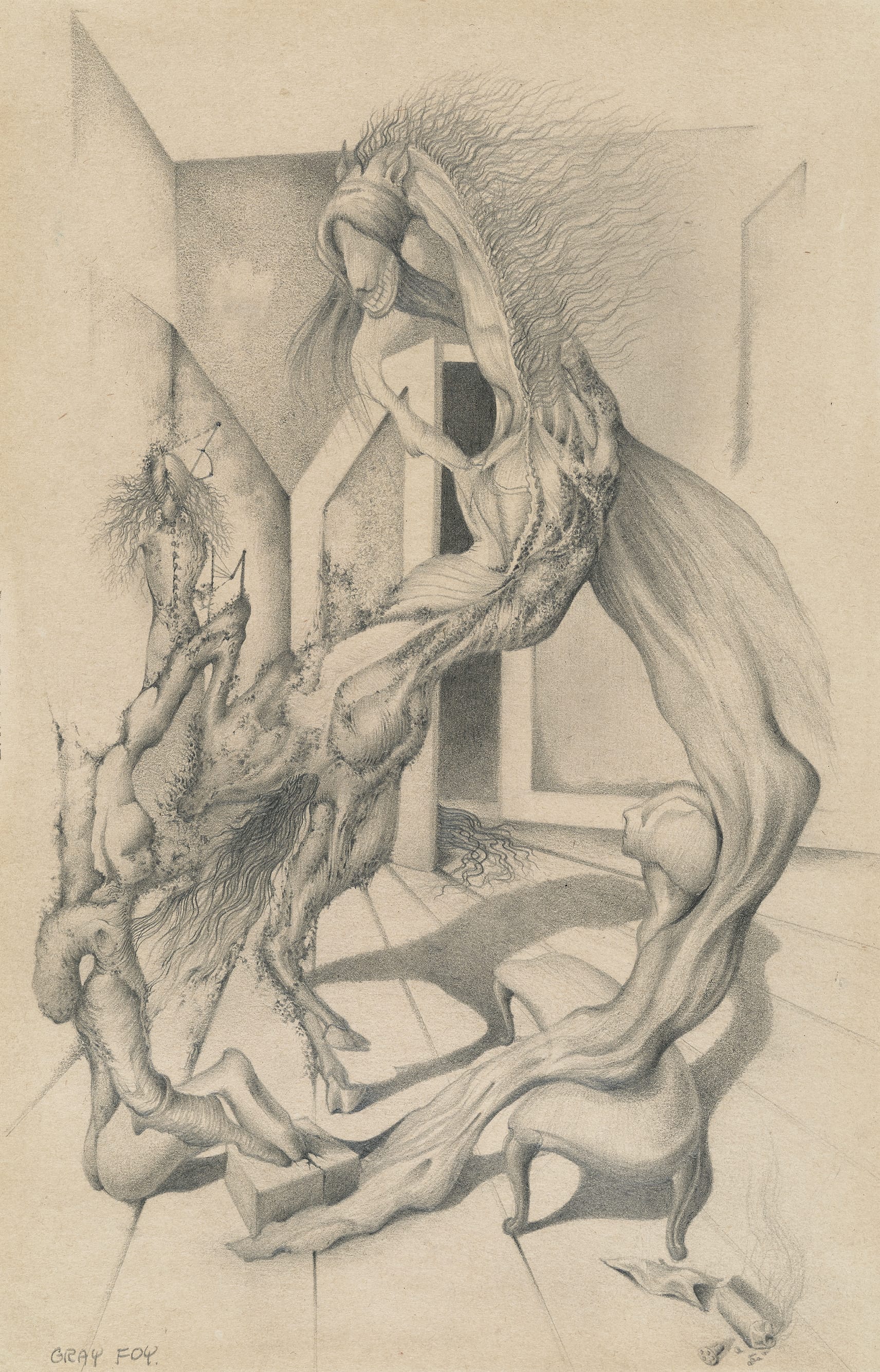 Although Foy made these drawings during World War II, he makes no overt reference to this worldwide calamity. And yet, disaster is clearly pervasive in the work. In drawings such as “Untitled (Interior with Morphing Figures and Animal)” and “Untitled (Interior with Cabinets and Distorted Figure)” (both ca. 1944), which were done on printed shipping-form paper, he mastered a Surrealist idiom that originated with Dali and Tanguy. He learned the subtleties of emblematic distortion and centered composition, drawing precisely exaggerated figural forms inside a perspectivally skewed, stage-like space in images that recall Dali’s “The Persistence of Memory” (1931) and “The Burning Giraffe” (1937).