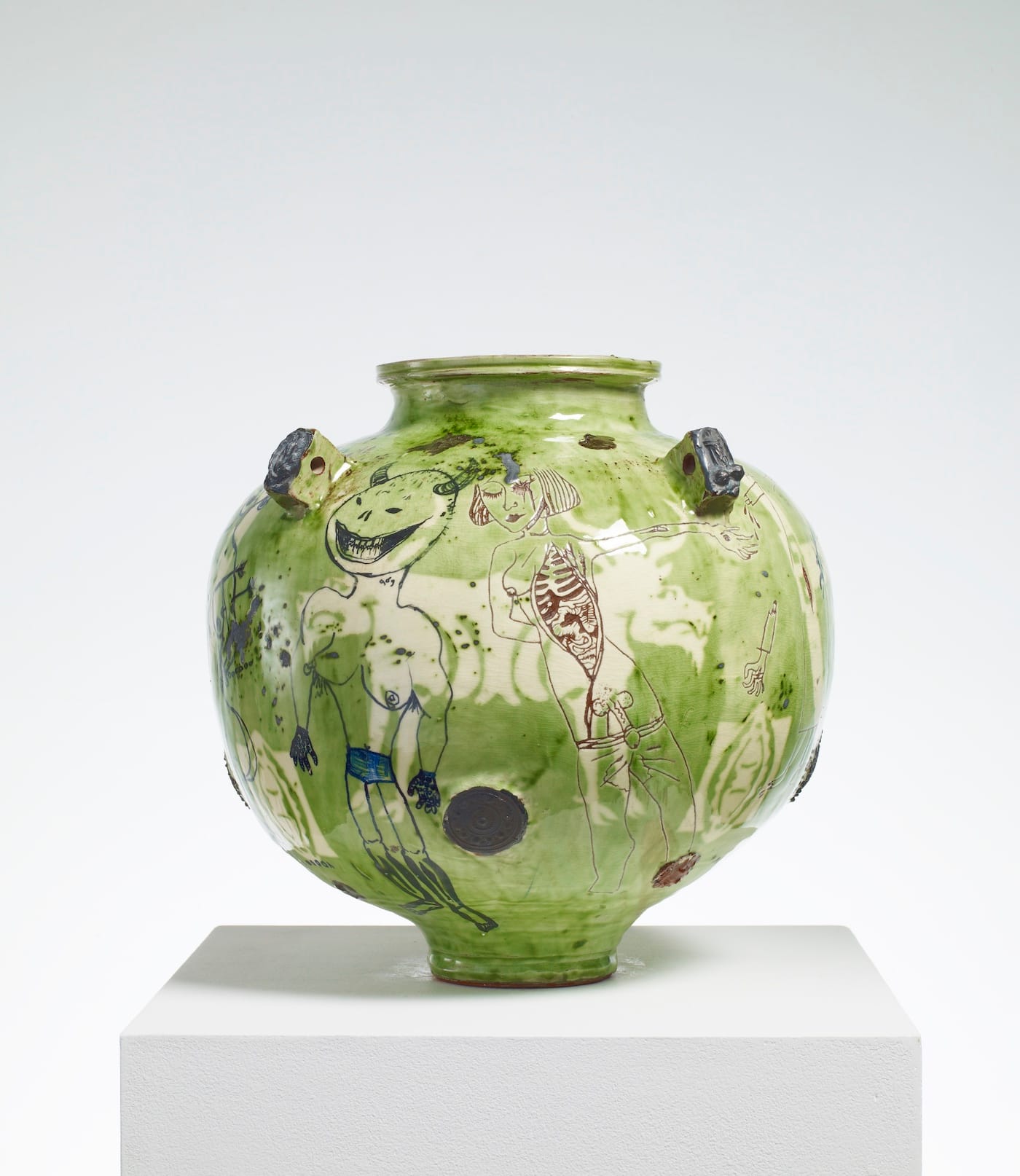 So we and the camera-bearers – who advance in front of him, semi-crouched, as if stalking some jungle beast – follow him, tripping over each other, mildly aggressive through our excessive politeness, all trying, desperately trying, to get half a look in, at this pot or other, as Grayson walks between the tightly wedged stacks of plinths topped by plexiglass boxes, regimented in rows, full of the spitty stuff of his youthfulness, prompted to reminisce by many softball questions from the director. It goes on for an hour or so.