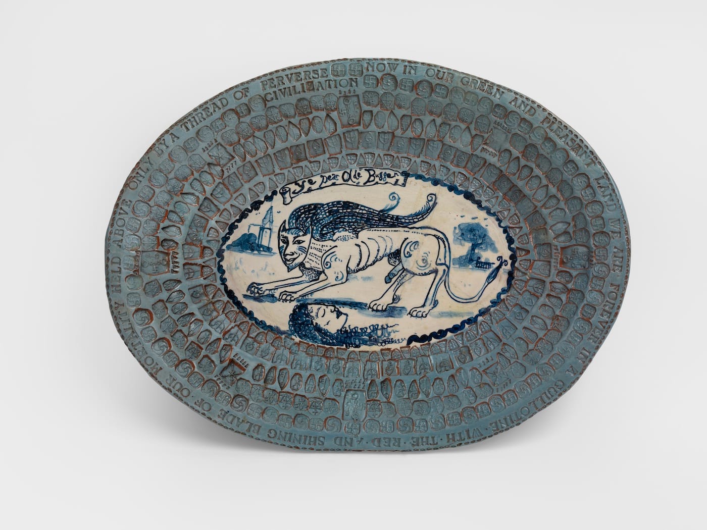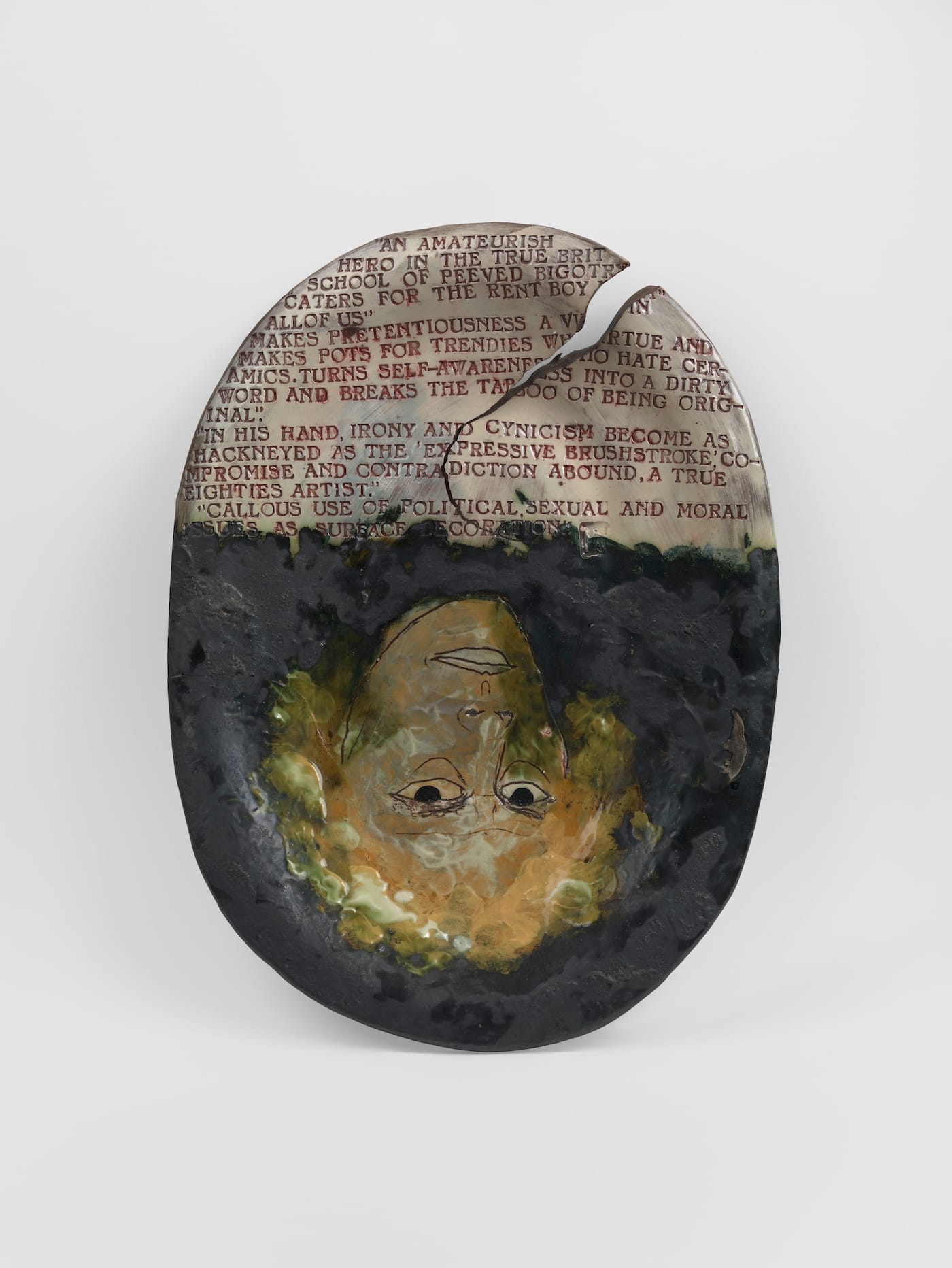 He’s good copy too. (We say that to each other, later, over the sandwiches, in the green room.) It’s always so relaxing knowing that you don’t have to think much because someone’s else’s words are always so quotable and to the point. After all, he was there, wasn’t he? He made all these wonky pots based on Classical Chinese originals or other kinds of originals. He added all these nastily provocative words, these fuck-you-mate transfers. He added the swastikas. You could order stuff like that in batches from any pottery factory in Stoke-upon-Trent. What is more, he wants these pots to be as imperfect as they are, imperfect as forms, that is. That’s the point: he’s imperfect. They’re imperfect. We’re imperfect. The only slight difference is that we’re us, and he’s Grayson.