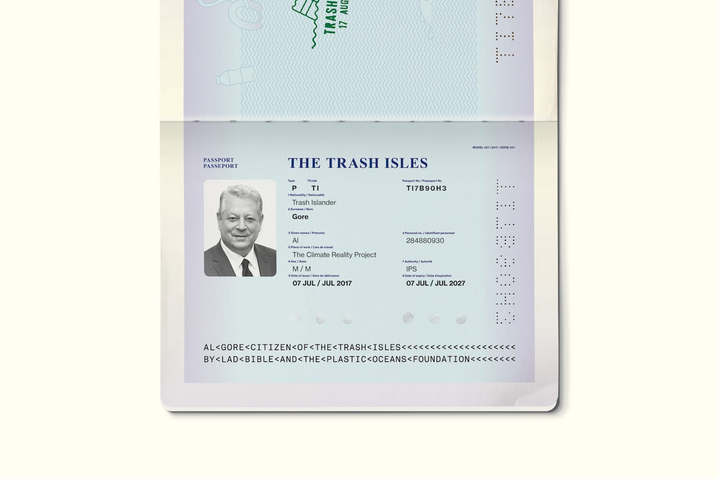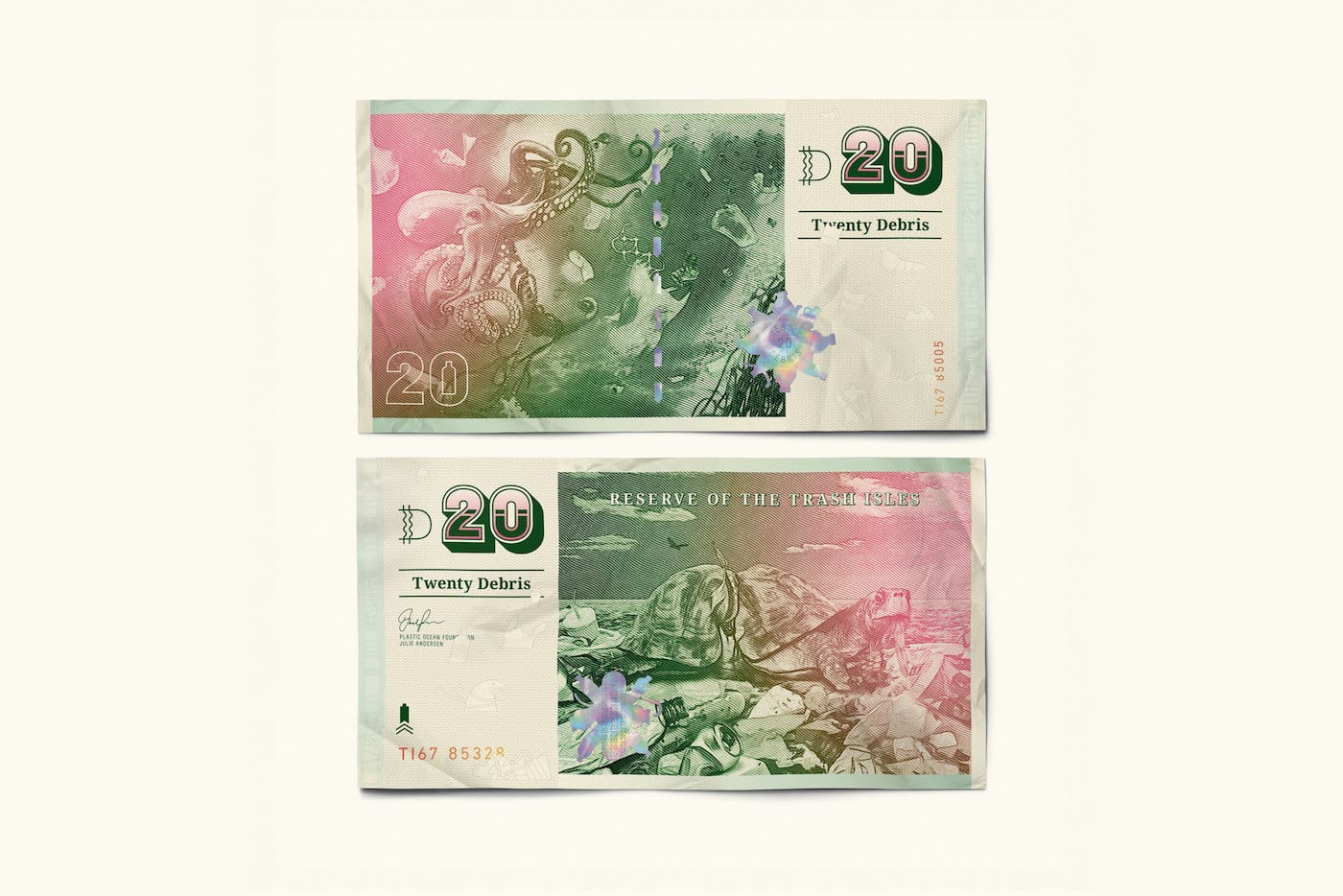 The original idea for Trash Isles arrived from advertising creative team Michael Hughes and Dalatando Almeida, who work as Dal & Mike. The pair had approached LADbible to reach a larger audience and expand the campaign through its editorial content. LADbible’s creative team also worked with illustrator Mario Kerkstra to shape Trash Isles’ identity. They came up with a flag that features a bobbing plastic water bottle; a passport with sea creatures tangled in rope; and bank notes that comprise the “Debris” currency, whose different denominations depict various visions of marine life ruined by pollution.