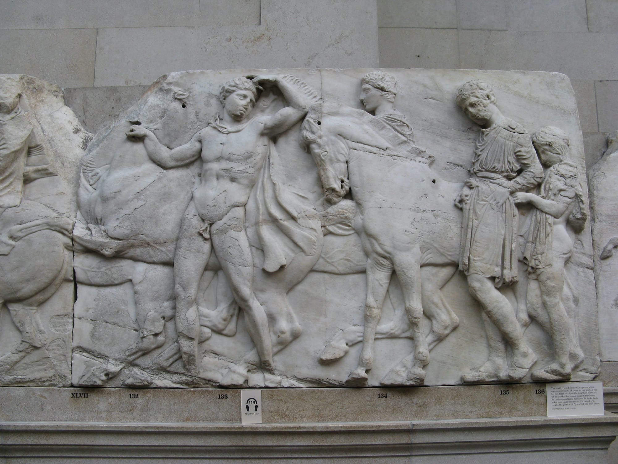 Created between 447 and 432 BCE, the Parthenon marbles depict gods and heroes, an ancient Athenian festival called the "Panathenaea," and a battle from Greek mythology. Much of the sculptural program has been destroyed, but the majority of what remains is housed at the British Museum.