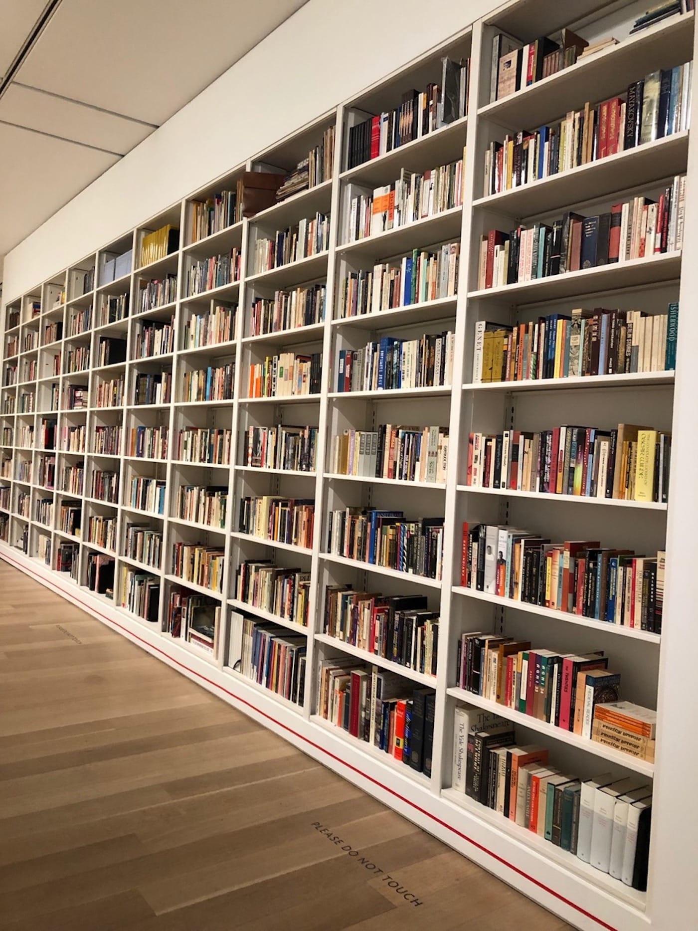The second large gallery, which is organized around four interior rooms, primarily serves as a survey of Bordowitz’s prodigious video works, including Portraits of People Living with HIV: Episodes 1-9(1988-1992), a series of “video portraits” that he created for the Gay Men’s Health Crisis. One particular portrait follows Bordowitz as he probes the meaning of an island-hopping boat trip that he took with five gay male friends who cared for each other through their HIV support group. In a poignant moment of intimacy, a friend tells Bordowitz that he sees the trip as a way of “trying to make your life mean something in a very strange time.” The experience of dying — of the AIDS crisis as jammed in a repeated beginning — framed the portrait of their shared lives. The retrospective concludes with an installation of Bordowitz’s personal library, inviting you to browse the spines of the countless books with which he has spent decades making meaning.