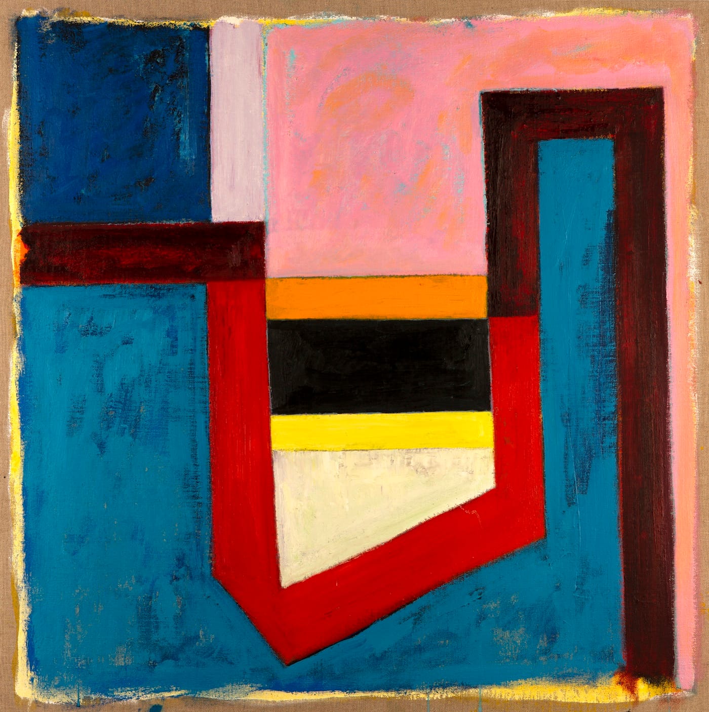 Amenoff is brilliant at putting together complex combinations of hues that reinforce each other in surprising ways. The extreme range of values in “Brilliant Corners” (2017-18; 36 x 36 inches) spans peach-tinted white and lemon yellow all the way to burgundy-black, but these hues also function as chroma. That’s hard to do. A bellowing red band surrounding this central area is its equal in visual force, and the enclosing serene blue mellows out the situation.
