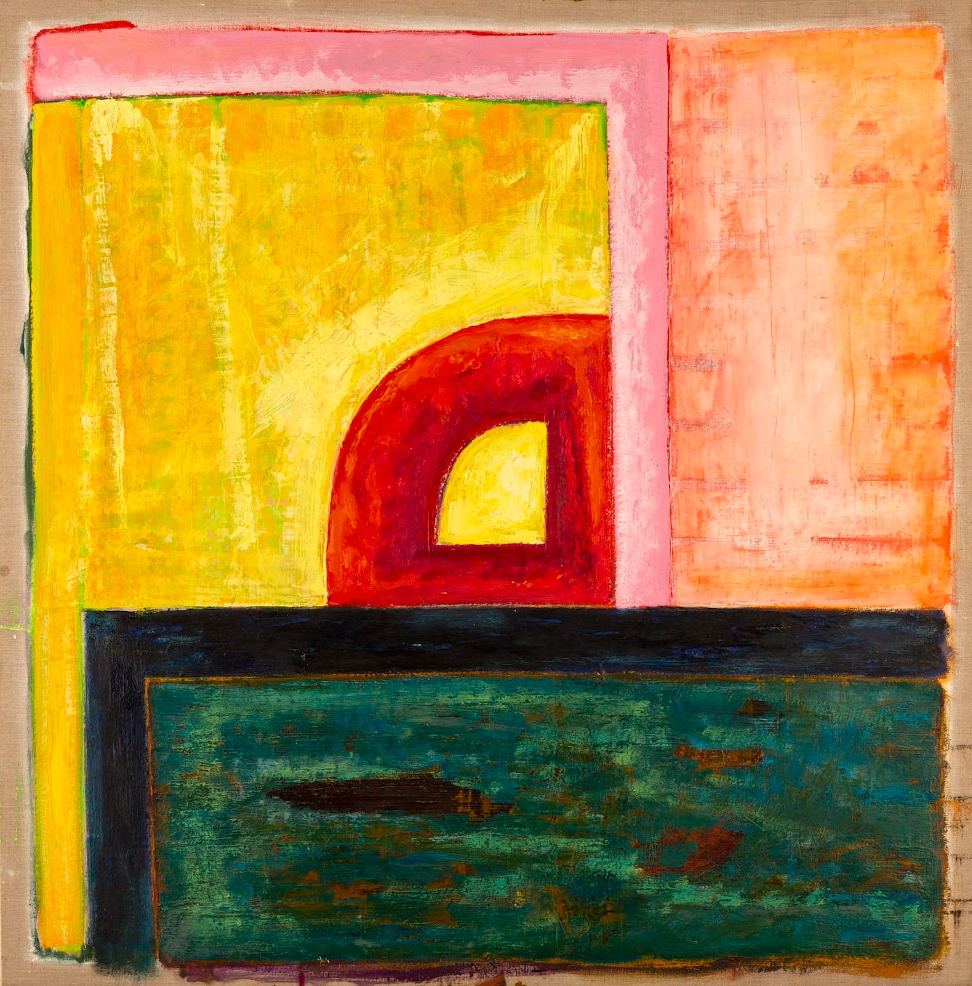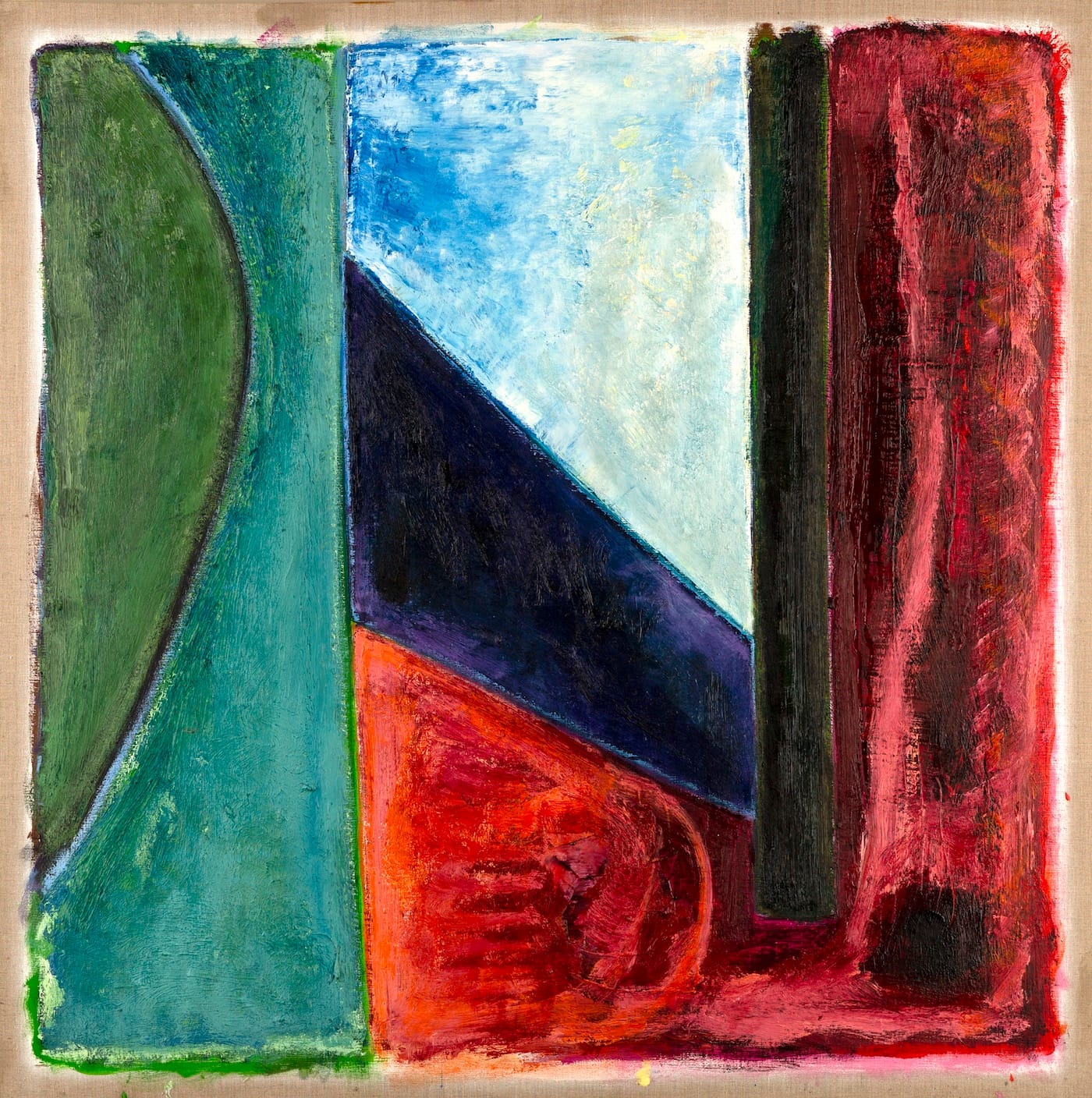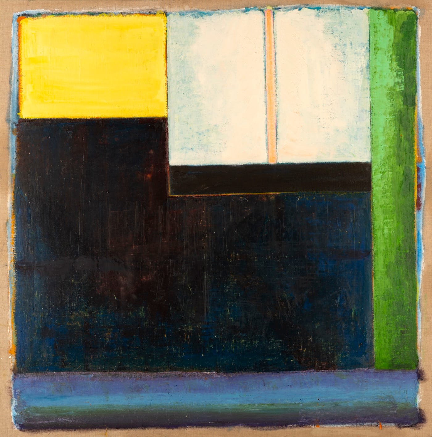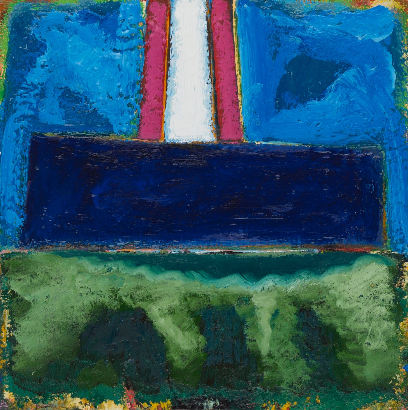 In the larger works (and a few of the small ones) the paint doesn’t quite extend to the edge of the canvas. The image is delimited by a brushy, wavering outer boundary that leaves a margin of about an inch of unpainted linen surrounding the composition.