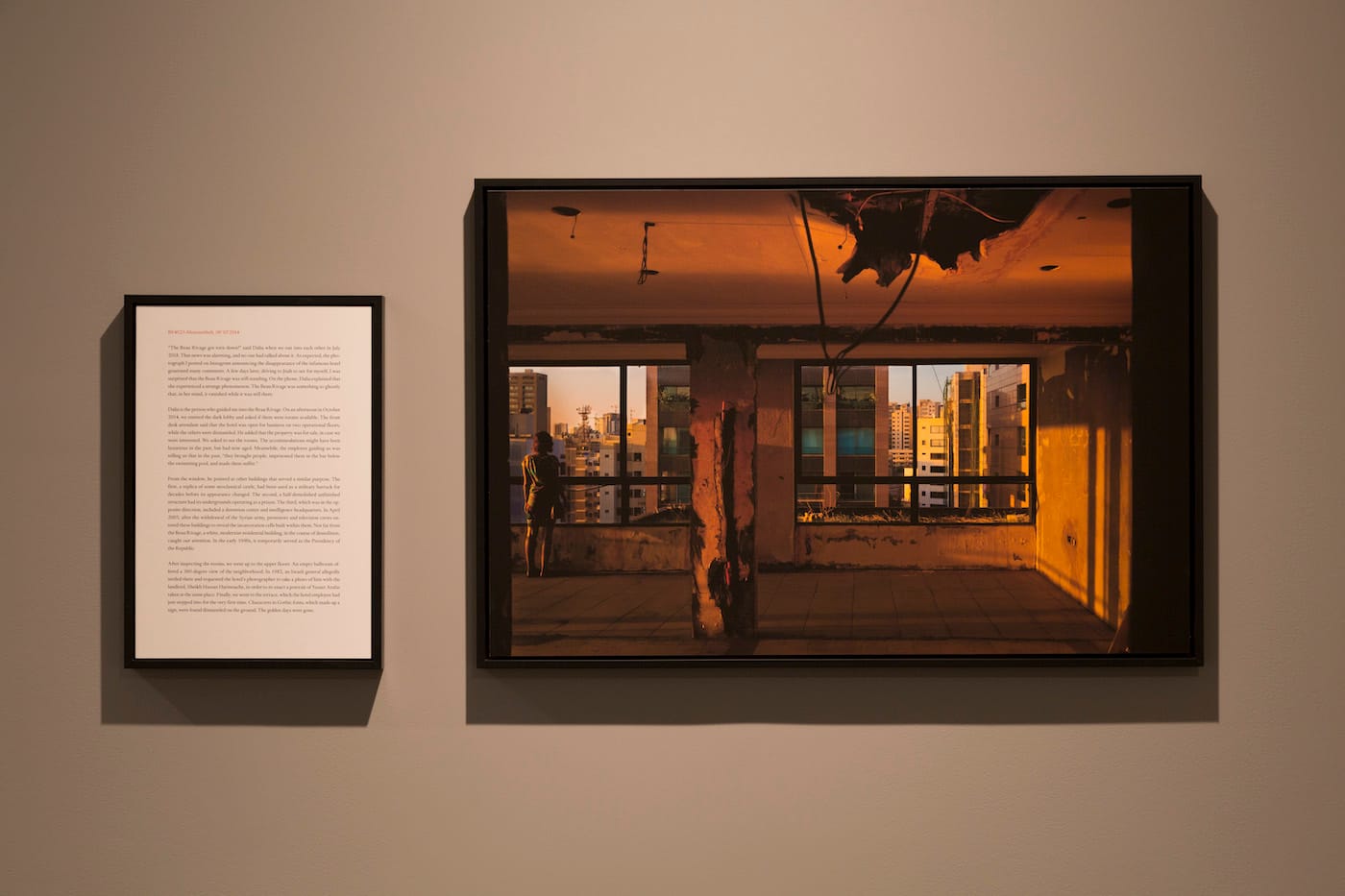 The resulting staged photographs — displayed alongside narratives about the structure’s history and Buchakjian’s encounter with it — incorporate lonesome female figures, frequently in white. The trope of the ghostly woman can seem tired and essentialist. But at least these figures don’t dominate the images, and Buchakjian reasons that male subjects would immediately have reminded the viewer of militiamen or snipers — many of whom inhabited these structures during the years of civil conflict.
