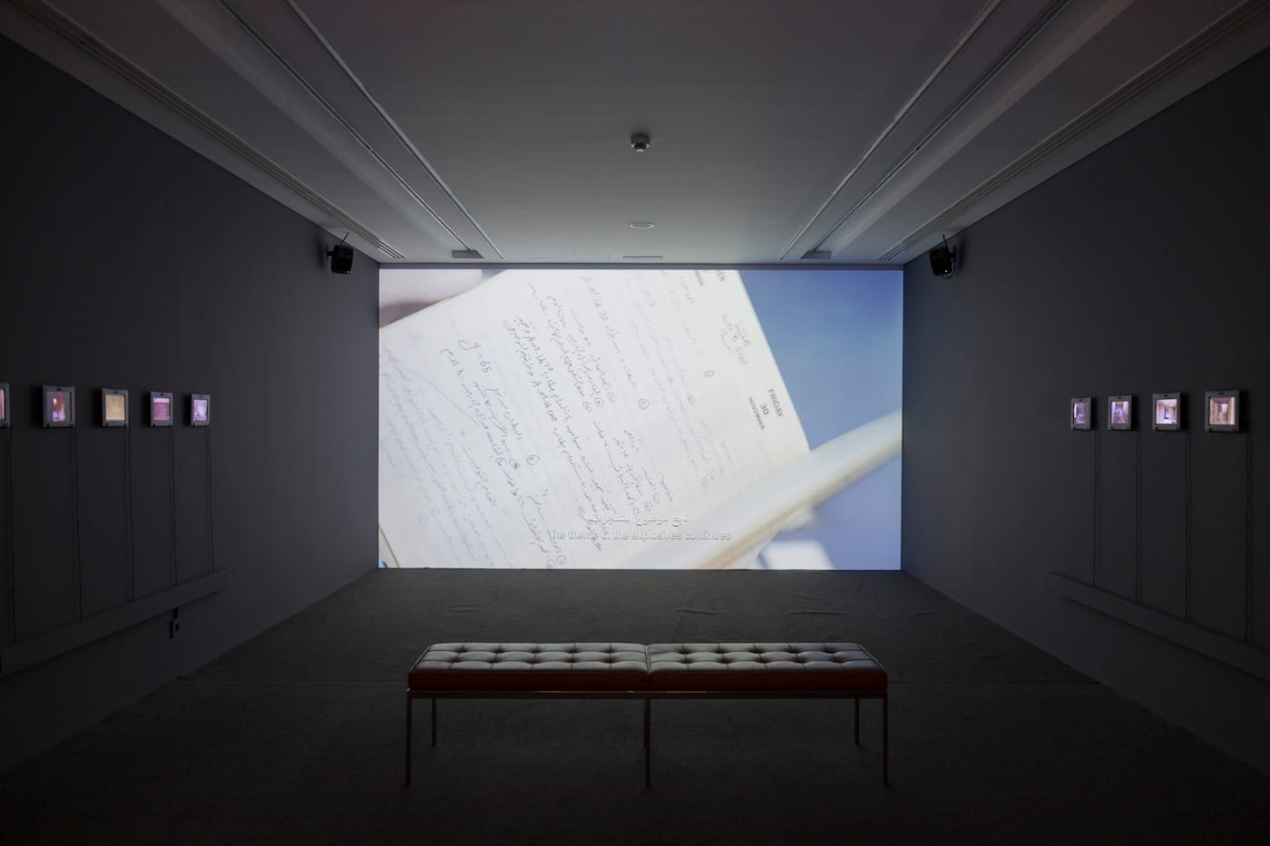 Some of these stories are laid out in the video “Abandoned Dwellings, Archive,” in which Buchakjian and his collaborator Valerie Cachard examine the miscellanea, reading aloud excerpts of the found documents, interspersed with their own observations. A gloved hand snaps a woman’s purse, brown with age, open and closed; interior design plans are unrolled like parchment. “Damn the situation is messed up… the bombing doesn’t stop since this morning” — “To the smartest and brightest natural blonde on the upper floor: happy birthday!” — “A photograph of ghosts or a ghost of a photograph?” — “All the lists in this empty diary are strange.”