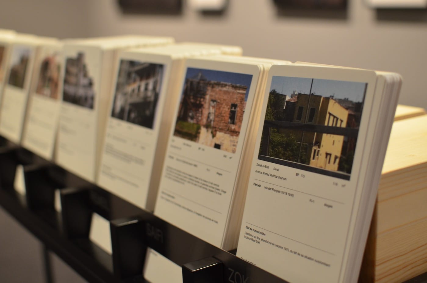 Buchakjian’s photographic project became only one element of a broader effort to survey the city’s abandoned houses and unearth the lives that had passed through them. From 2009 to 2016, the photographer found well over 700 buildings, entering around 140 of those. “I was trying to do a comprehensive database, which was totally utopian,” he says, ruefully. Nevertheless, the breadth of his project is evident in the 760 data sheets, split into 11 Beirut areas, that are displayed alongside the photographs. Each sheet provides an exterior photograph of the dwelling (if one was taken before its destruction), as well as its location, era, architectural details, and state of conservation. Beirutis can flip through an inventory of their neighborhood, retrieving details of half-collapsed structures they’ve never really looked at before.