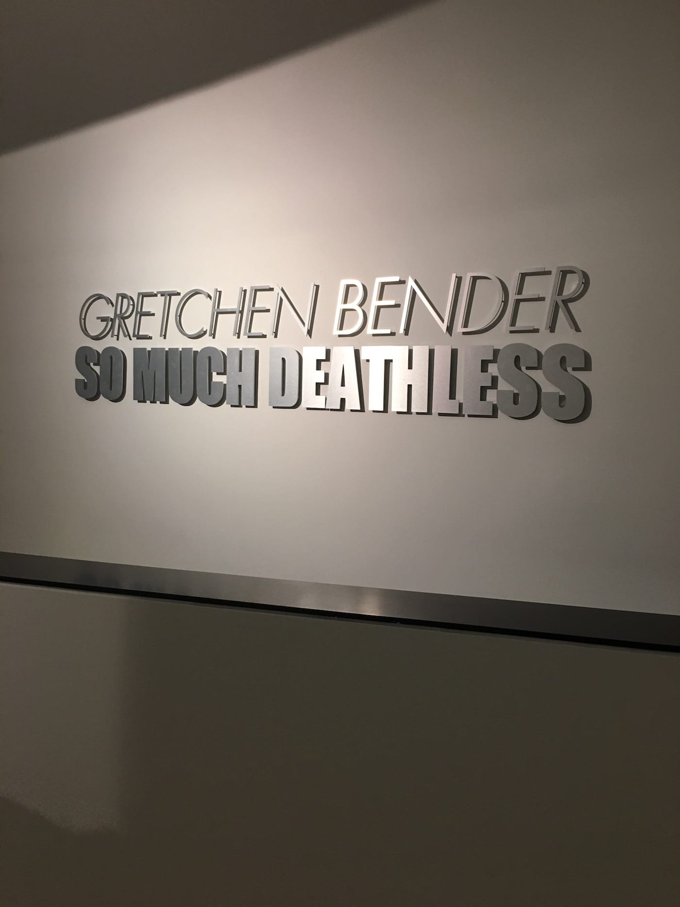 Tracking the Thrill effectively paved the way for So Much Deathless, currently on view at Red Bull Arts New York. Bender’s first retrospective since 1991, it includes over 30 works created between 1982 and 2001. The show’s overall scope, design, and ambition are extraordinary. It has been curatorially calibrated for maximum viewer engagement. Discreet touchscreens peppered throughout the show present concise oral histories by Denker, Longo, Vanderhyden, and many others. Burnished metal wall labels mirror the aesthetic of Bender’s steel sculptures, their fonts sourced from the artist’s exhibition materials.