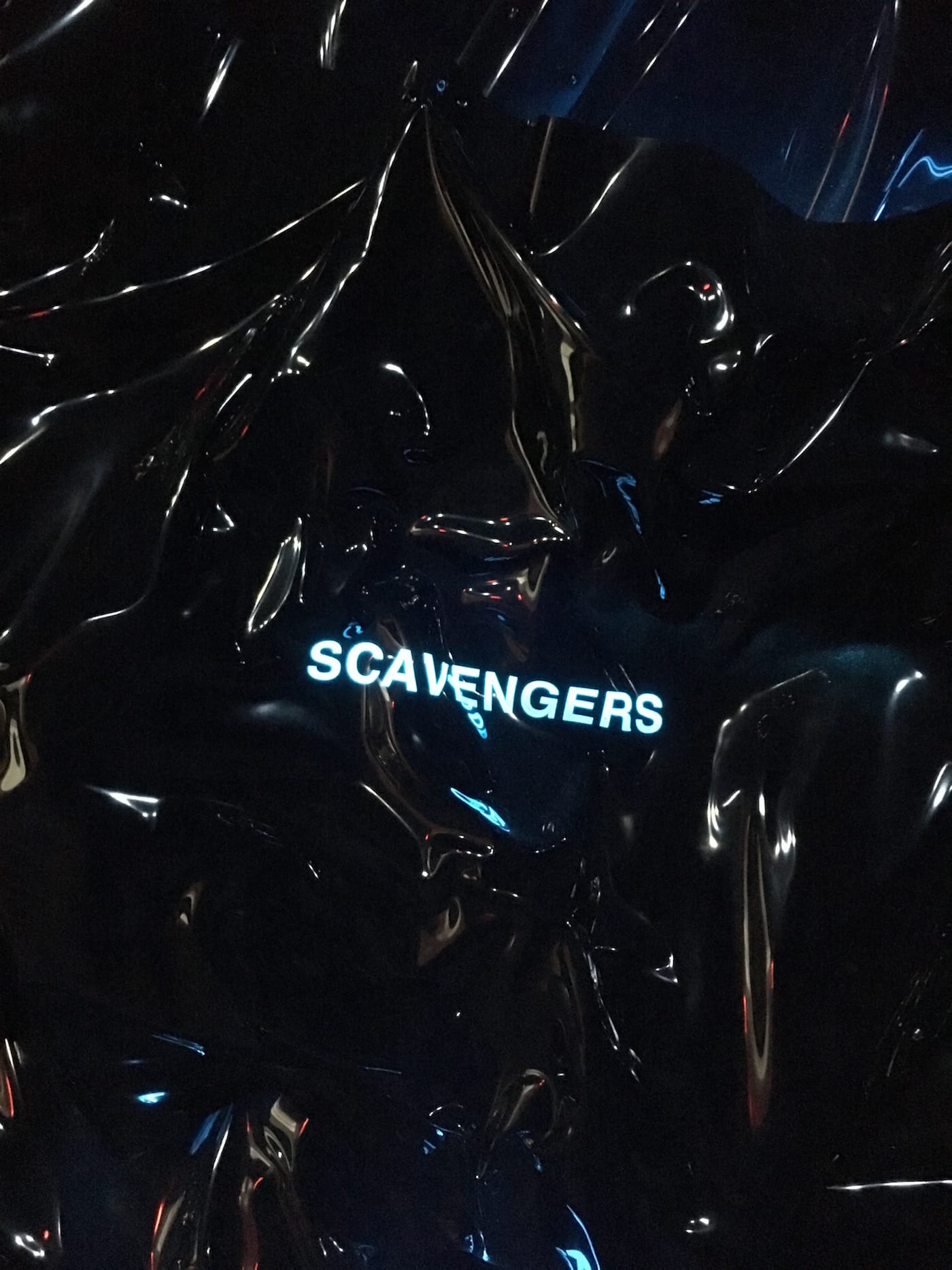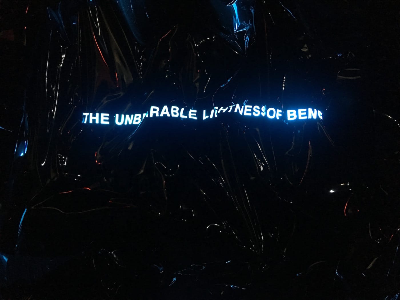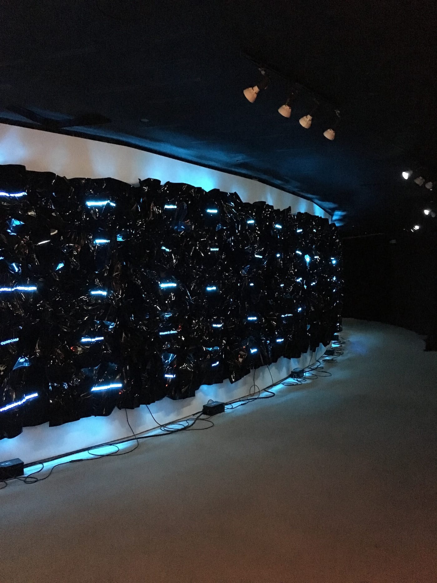 “People in Pain” embraced obsolescence by design, functioning as a self-reflexive meditation on memory, time, and cultural value. Inspired by Maya Lin’s Vietnam Veterans Memorial, the work is monumental in scale, stretching over 45 feet long. Its glossy, crumpled surface has been variously likened to an oil slick, an ocean of garbage, and a wall of discarded film stock. It literalizes what the interior landscape of a dead computer server might look like: a sea of fragmented data lost in virtual darkness.