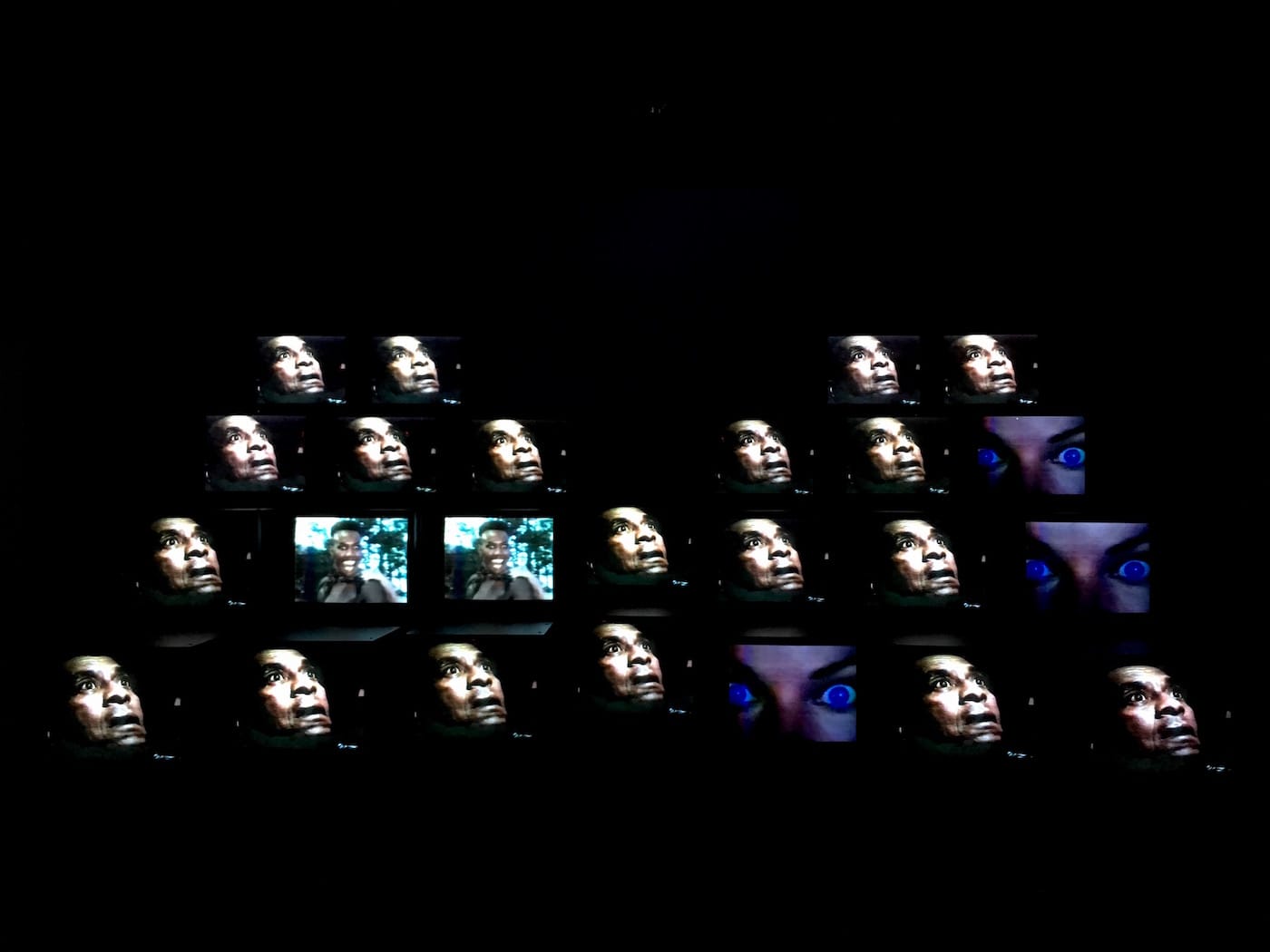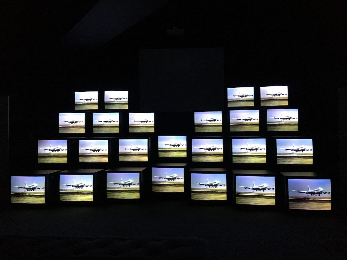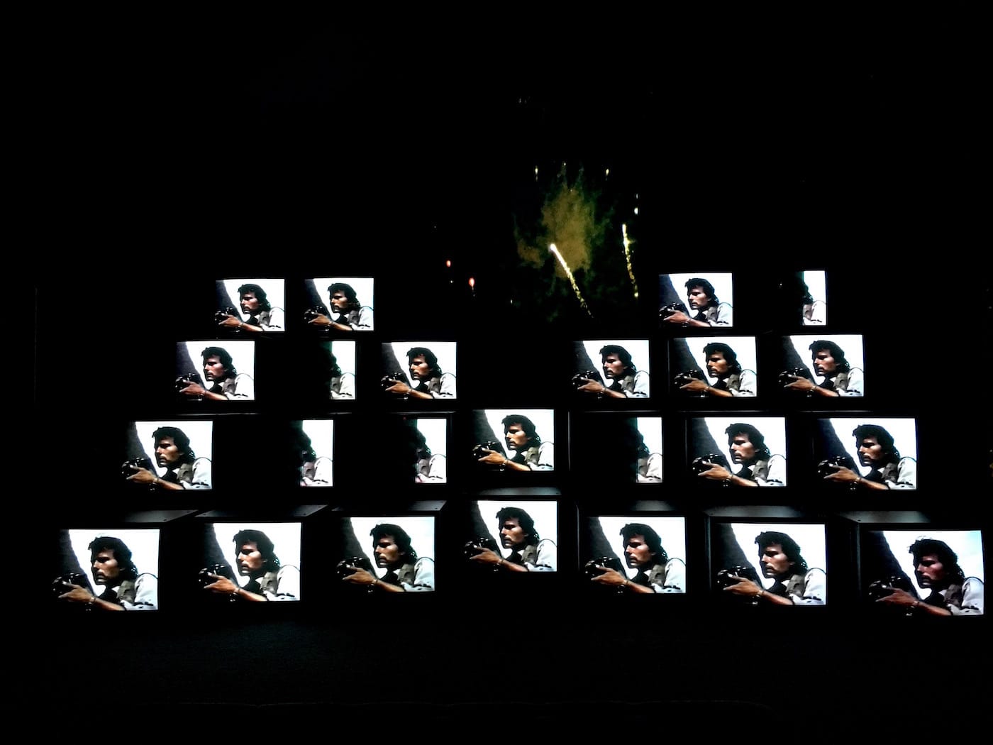 The highlight of the show is “Total Recall” (1987), a thundering, body-shaking contemplation of mass media that ought to be as renowned as Christian Marclay’s “The Clock” (2010). The installation, which Bender described as “an anti-spectacle spectacle,” is an 11-channel, 18-minute film screened over 20 stacked television monitors and 3 projection screens. Its score was devised by Stuart Argabright, another of Bender’s regular collaborators.