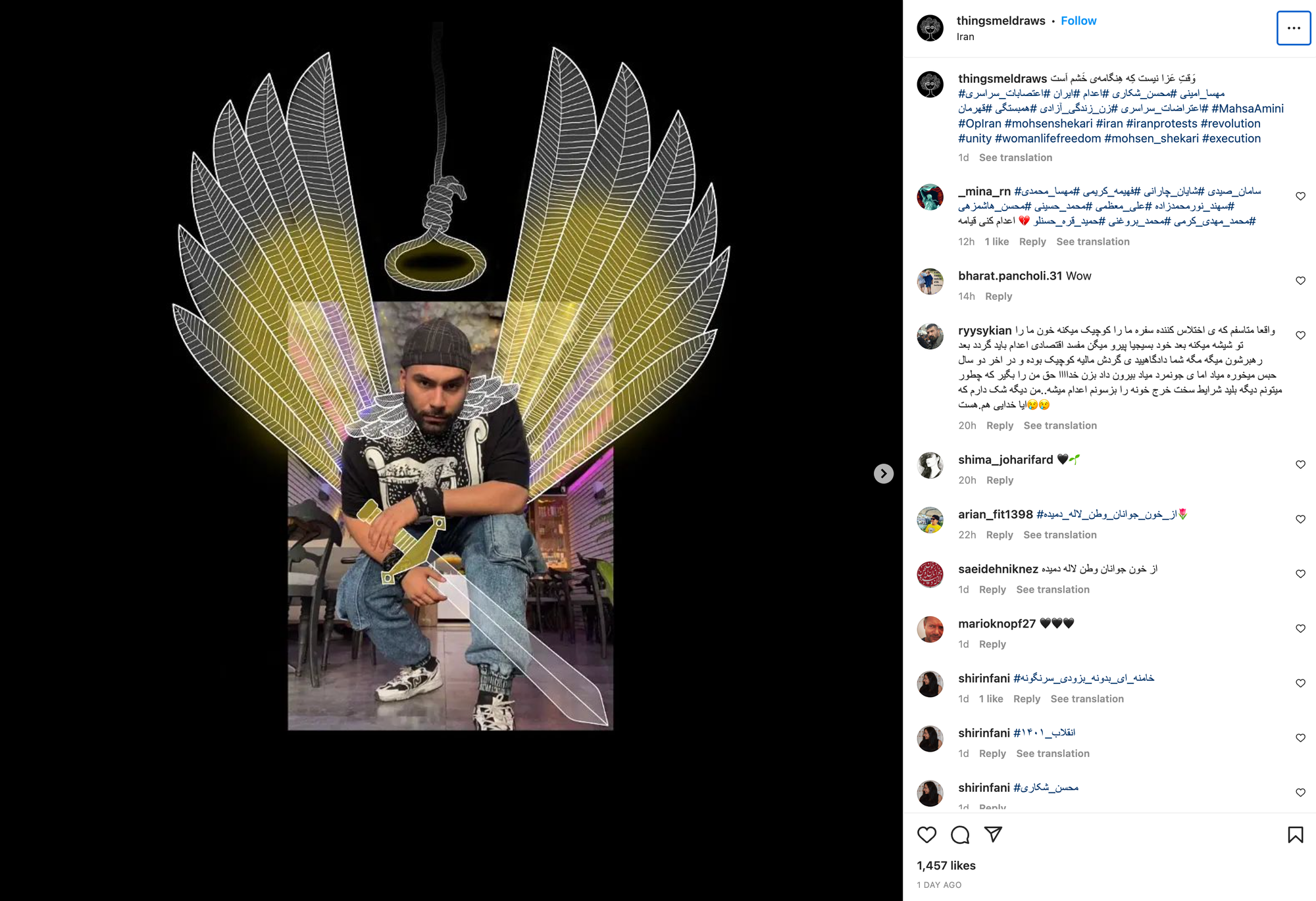 Shekari's hanging is the first of many official demonstration-based executions announced by the Islamic Republic of Iran, not including the more than 450 civilian deaths at the hands of the regime. Online, dozens of artists have posted tribute artworks in honor of Shekari's life and bravery, calling for the end of the death penalty and immediate release of protesters.