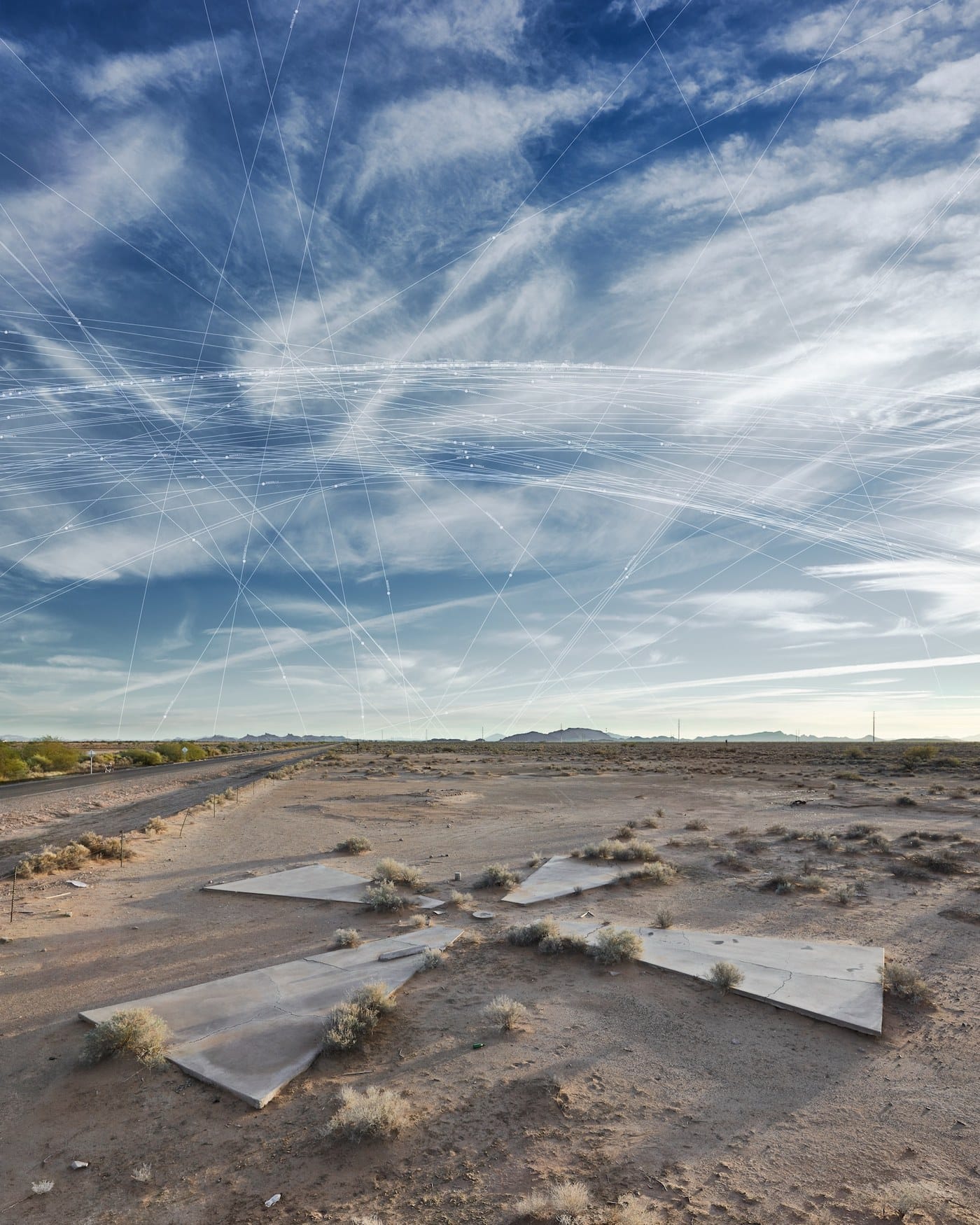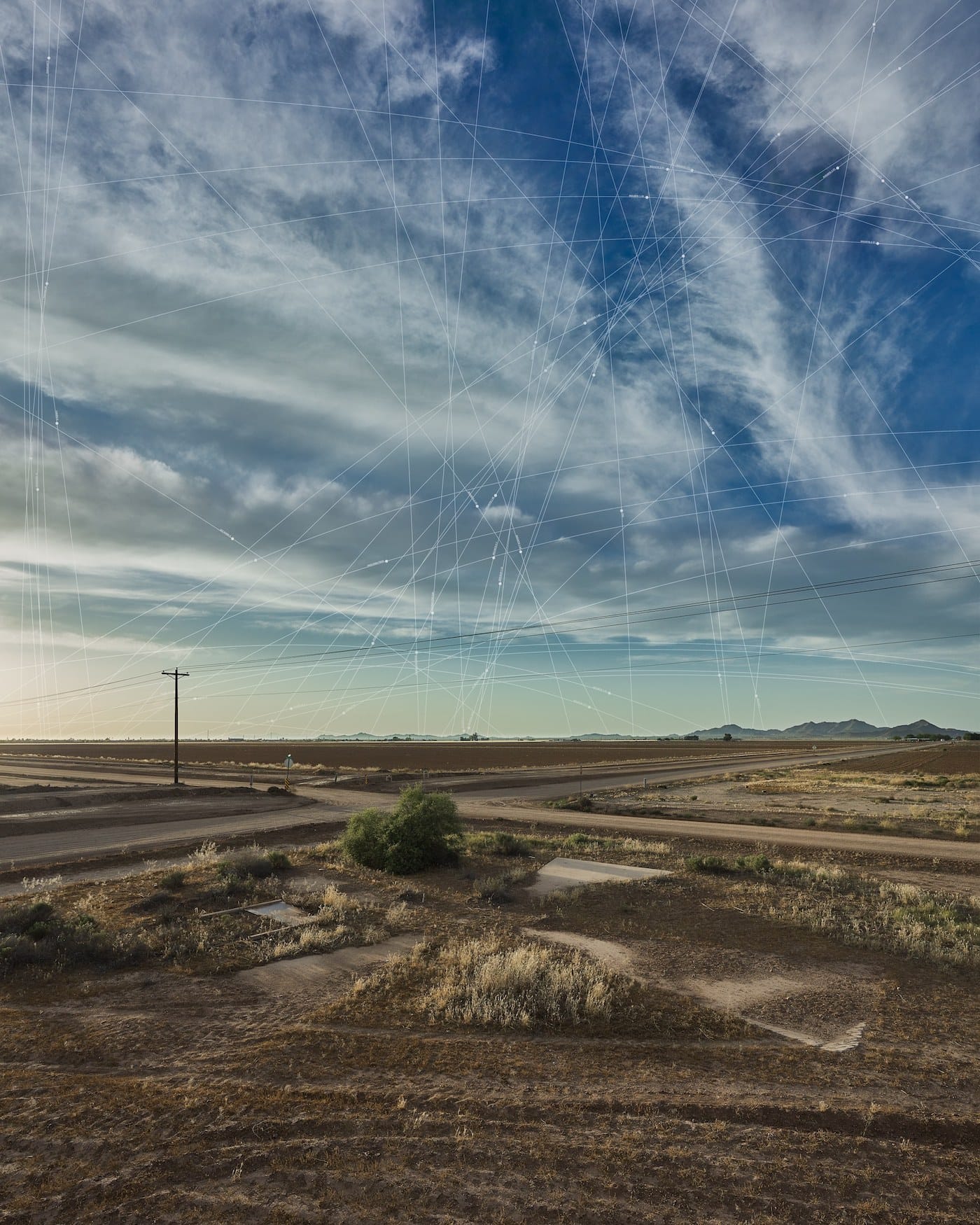 The pair has also created an interactive map of the markers, each of which is represented by one of their pictures (they’ve shot over 40) or by a historical or recent aerial photograph. Some markers are barely detectable beneath dirt or grass, mostly crumbled away; others are strikingly preserved, adjacent to homes and roads. The Center for Land Use Interpretation notes that there are “dozens of aerial photo calibration targets across the USA,” most of them made in the midcentury and many still on restricted land. The Corona markers transmit a narrative about the past, even while they’re obsolete as technological devices. By juxtaposing the Cold War–era markers on the ground with contemporary satellite paths in the sky, Anand and Sauer encourage a new consideration of how we’re present within huge, sometimes invisible information networks.