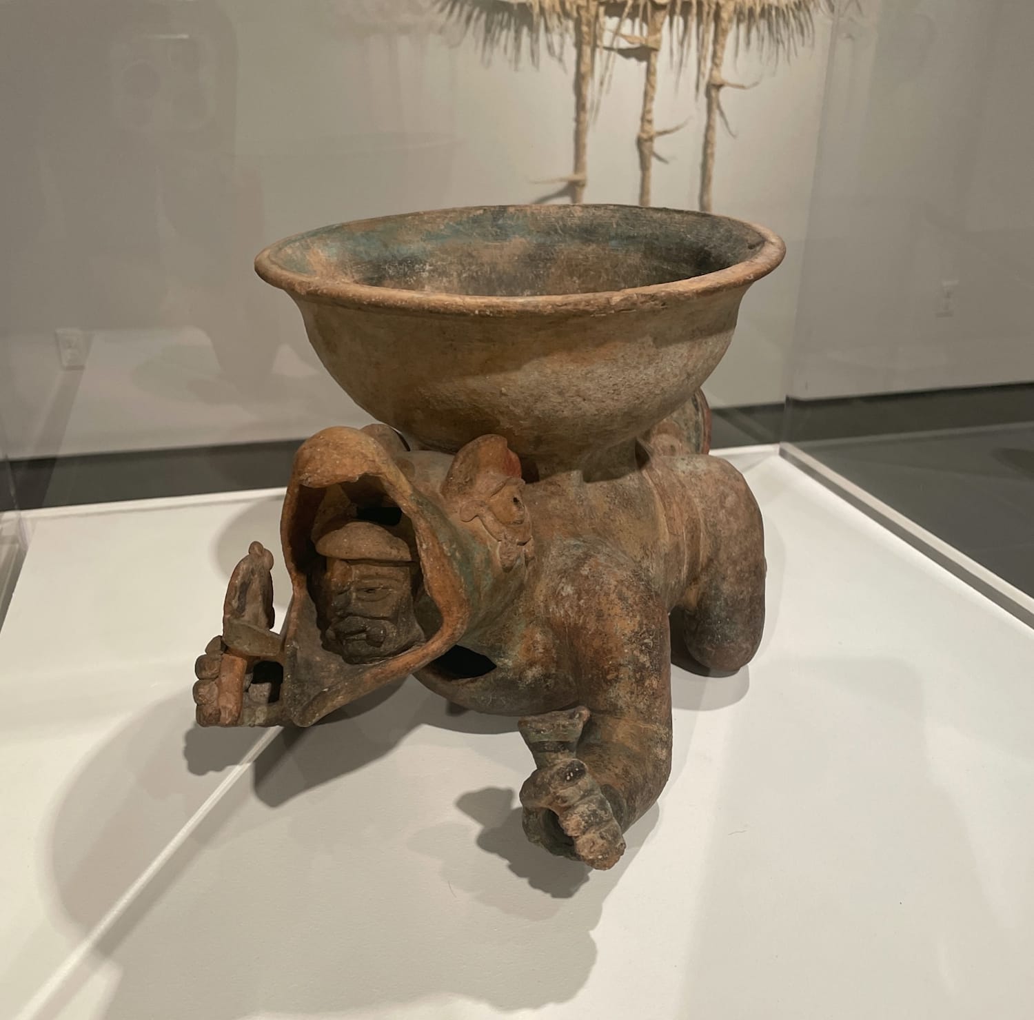 The power of spirits to enchant the world — and the human propensity to be enchanted by it — is manifest throughout the show. In one of the vitrines, a god springs from a flower in a Mayan ceramic whistle; the musical instrument embodies a human relationship with the occult that relies on intermediaries. Other prehistoric examples Maravilla selected include trumpets, conches, and animal- and human-shaped ritual vessels. In the splendid, tiny “Figurine of a Woman Sheltering a Man” (600-800 CE), which she does within the folds of her stomach, the composition’s uncanny literalness suggests female fertility. But the figure’s doubleness — one body cradling another — also points to the complexity of being.