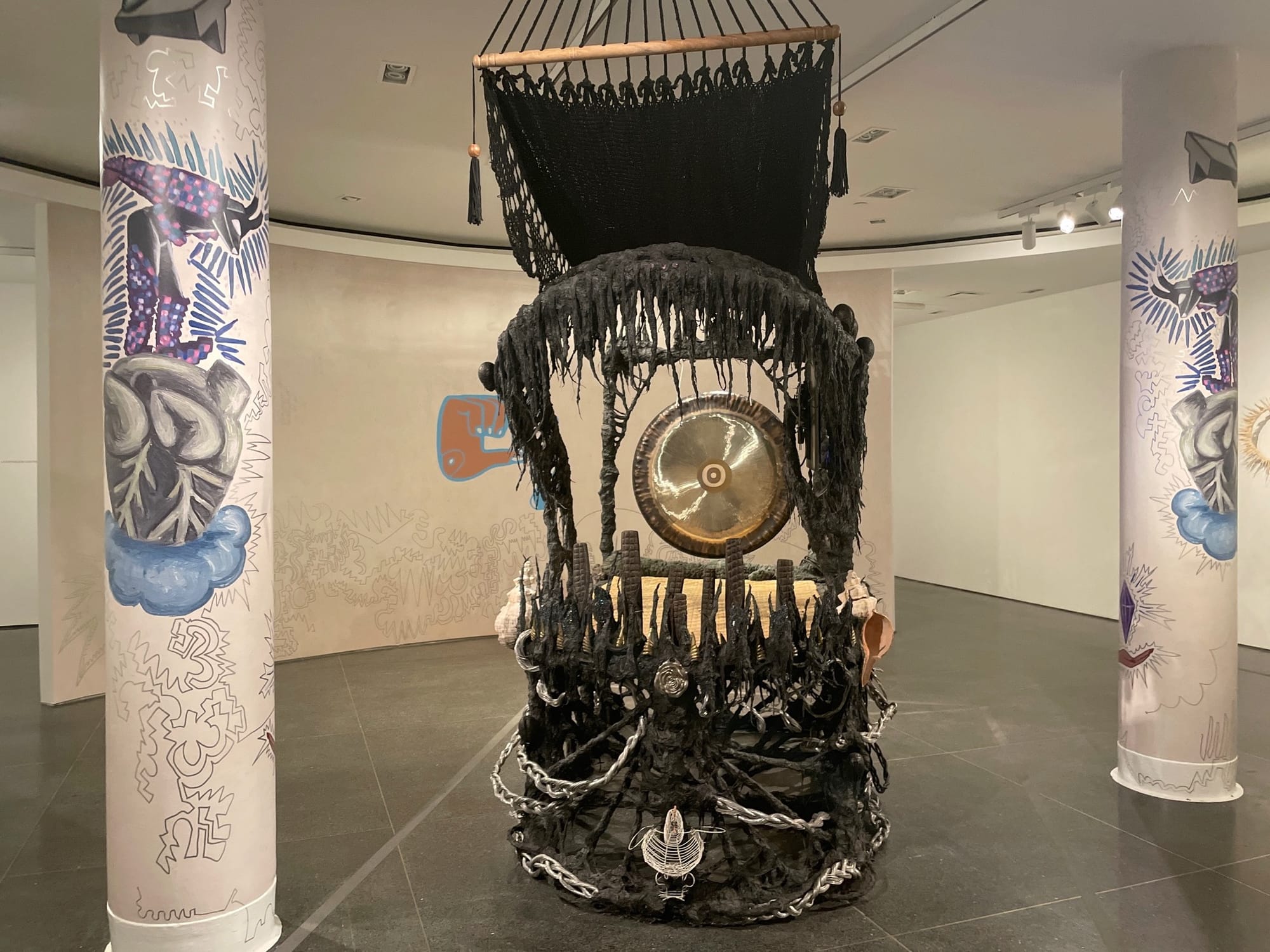 The exhibition, titled Tierra Blanca Joven — which means “young white ash/earth” in Spanish, alluding to the concept of renewal through scorching — consists of freestanding sculptural works, video, mixed-media pieces, drawings on walls and pillars, and a small group of pre-Colombian artifacts from the museum’s collection, selected by the artist and displayed in glass vitrines. The show’s focal points are three sculptures: “Disease Thrower “#18” (2021), located at the entrance of the single first-floor gallery that houses the exhibition, “Disease Thrower #12122012”(the date Maravilla learned he had cancer) and “Disease Thrower #0”(both 2022) at the exit.
