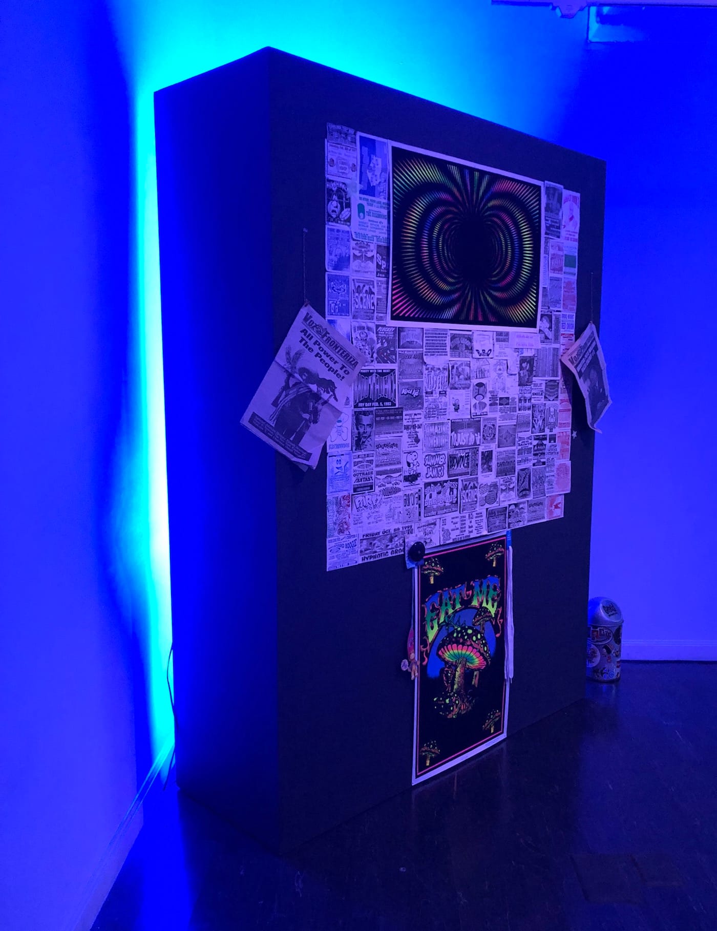 Rosales’s online archival projects form the basis of the IRL exhibition Echoes of a Collective Memory at VPAM. Instead of simply reproducing digital images in an analog space, the exhibition, which focuses primarily on Map Pointz, creates an immersive space of ephemera, light, and sound. Outside the gallery, visitors can pick up a pay phone to hear a woman giving the details to a party that night. Pre-internet, this was how parties were organized, via flyer, pay phone, and beeper, as “map points” led ravers on an underground scavenger hunt.