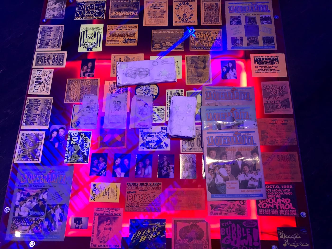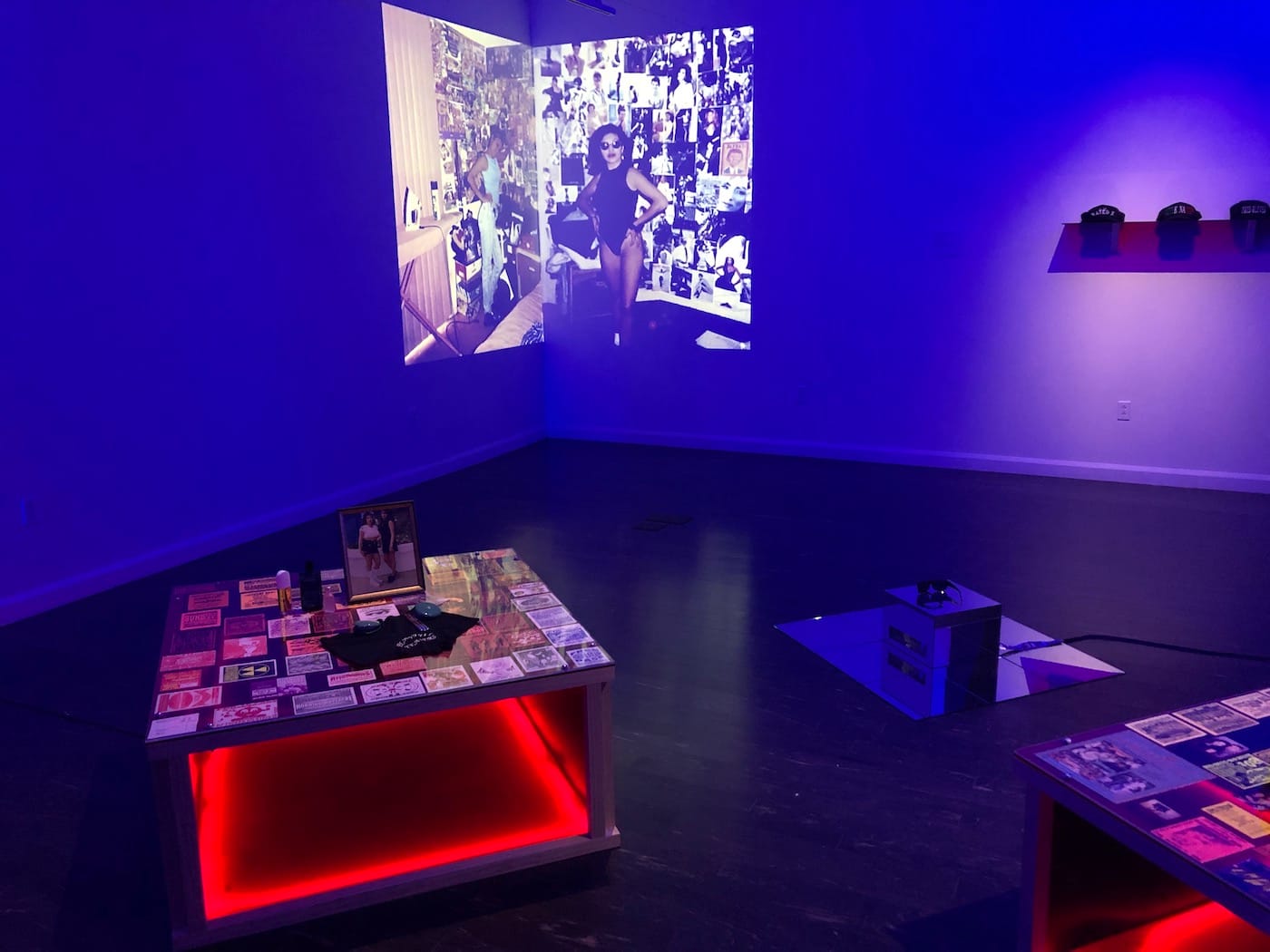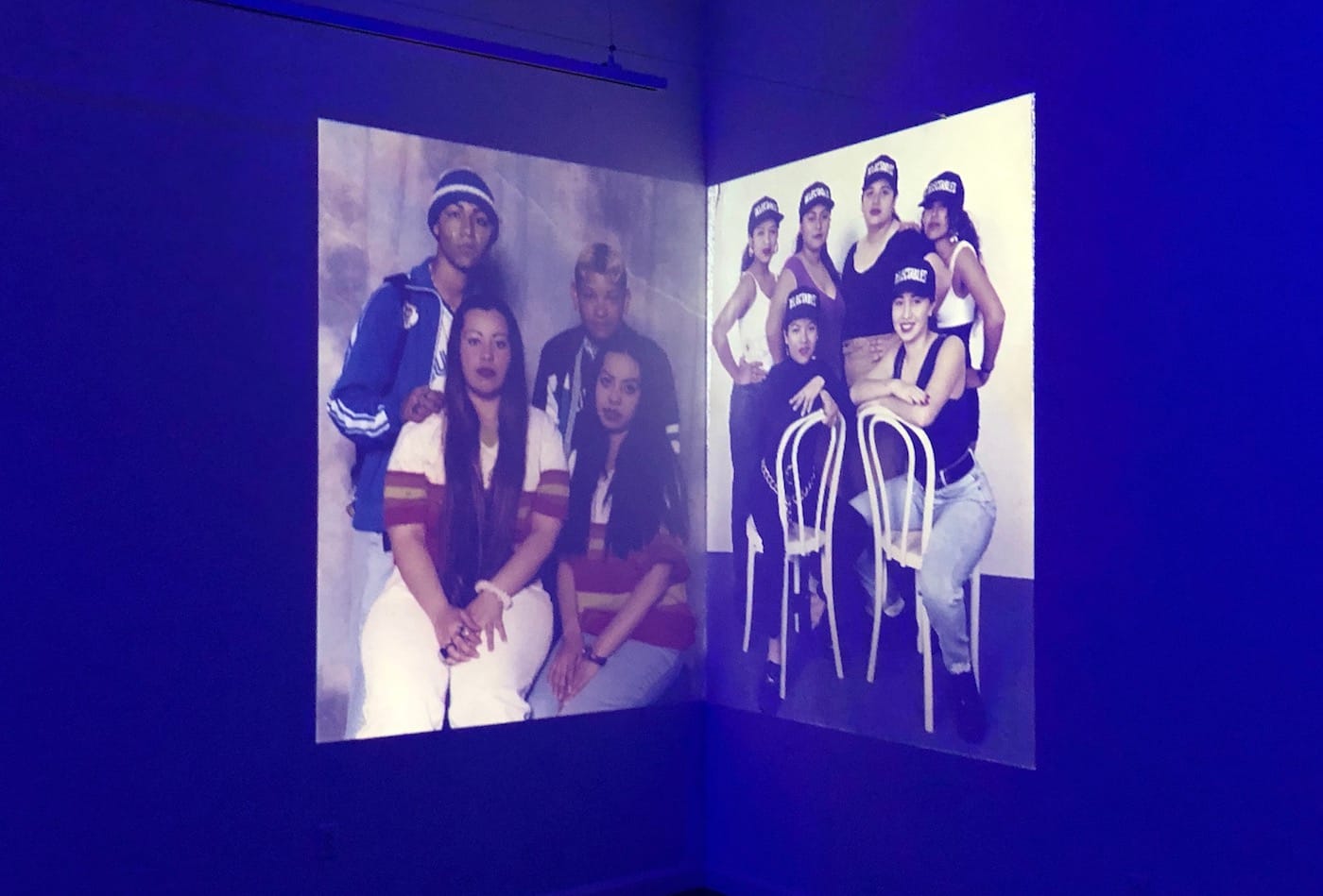The intimate gallery is bathed in a blue light, as the low throb of house music provides a soundtrack. A two-channel video slide show anchors the space, scrolling through images of Latinas with arched eyebrows and teased hair, posing proudly with their crews in staged photos. Next to the projection, three baseball hats repping the names of different party crews — including Rosales’s, called Aztek Nation — sit on a plexiglas shelf, which casts a colored shadow on the wall, recalling a Don Judd sculpture. Two plexiglas go-go boxes glowing a deep orange serve as display cases for various show flyers, wallet-sized photos, and other ephemera related to the rave scene. Alongside them are issues of La Quebradita magazine featuring banda groups on their covers.