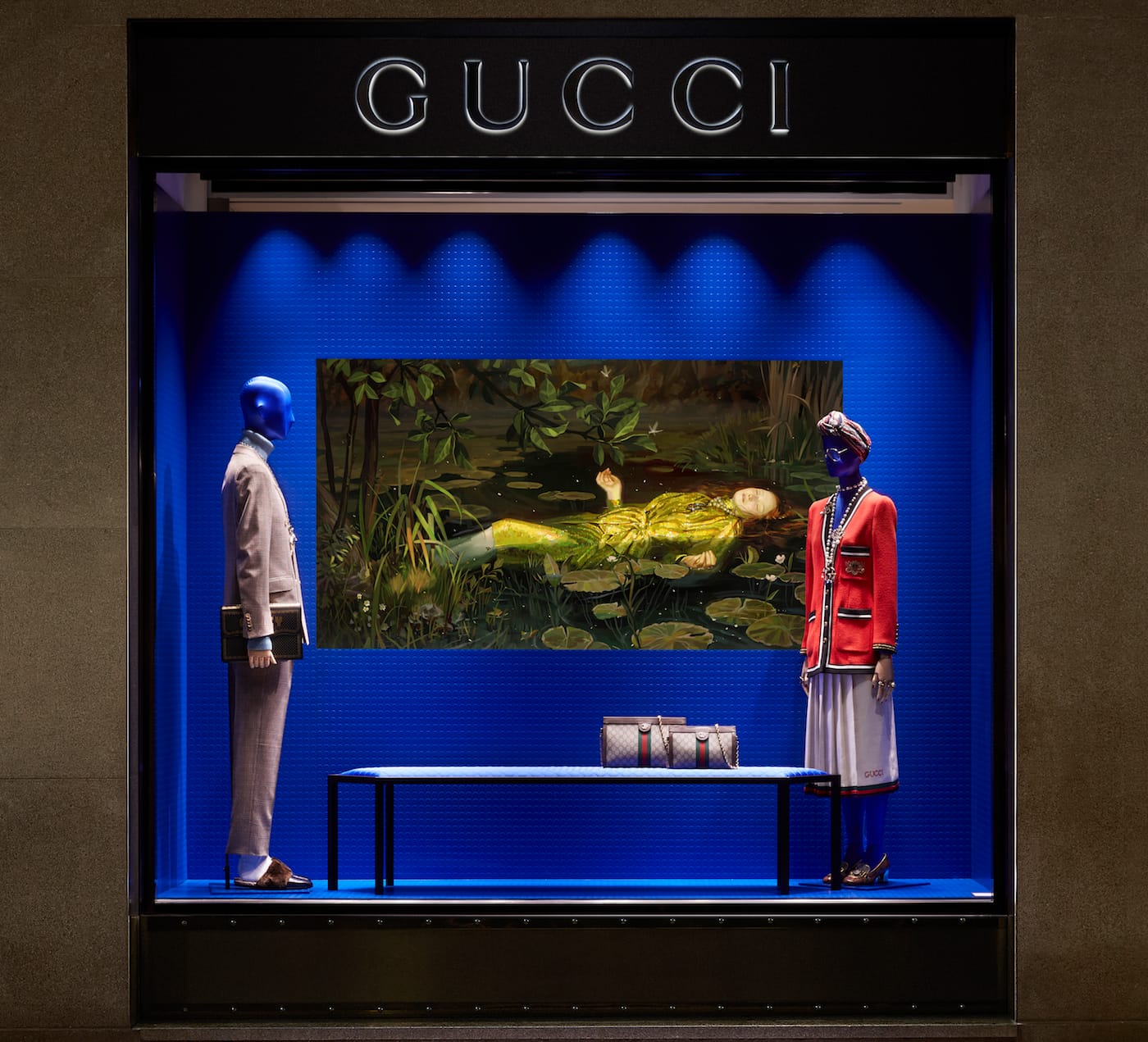 Inside the window design at Milan Montenapoleone boutique, an image from the #GucciSS18 campaign by #IgnasiMonreal inspired by the painting of ‘Ophelia’ (1852) by John Everett Millais which hangs in the Tate Britain in London appears on a large screen. #AlessandroMichele pic.twitter.com/y6fuP9498O