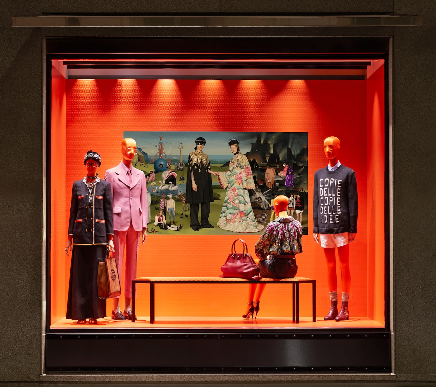 Gucci has also installed mannequins that lifelessly watch video versions of appropriated art.