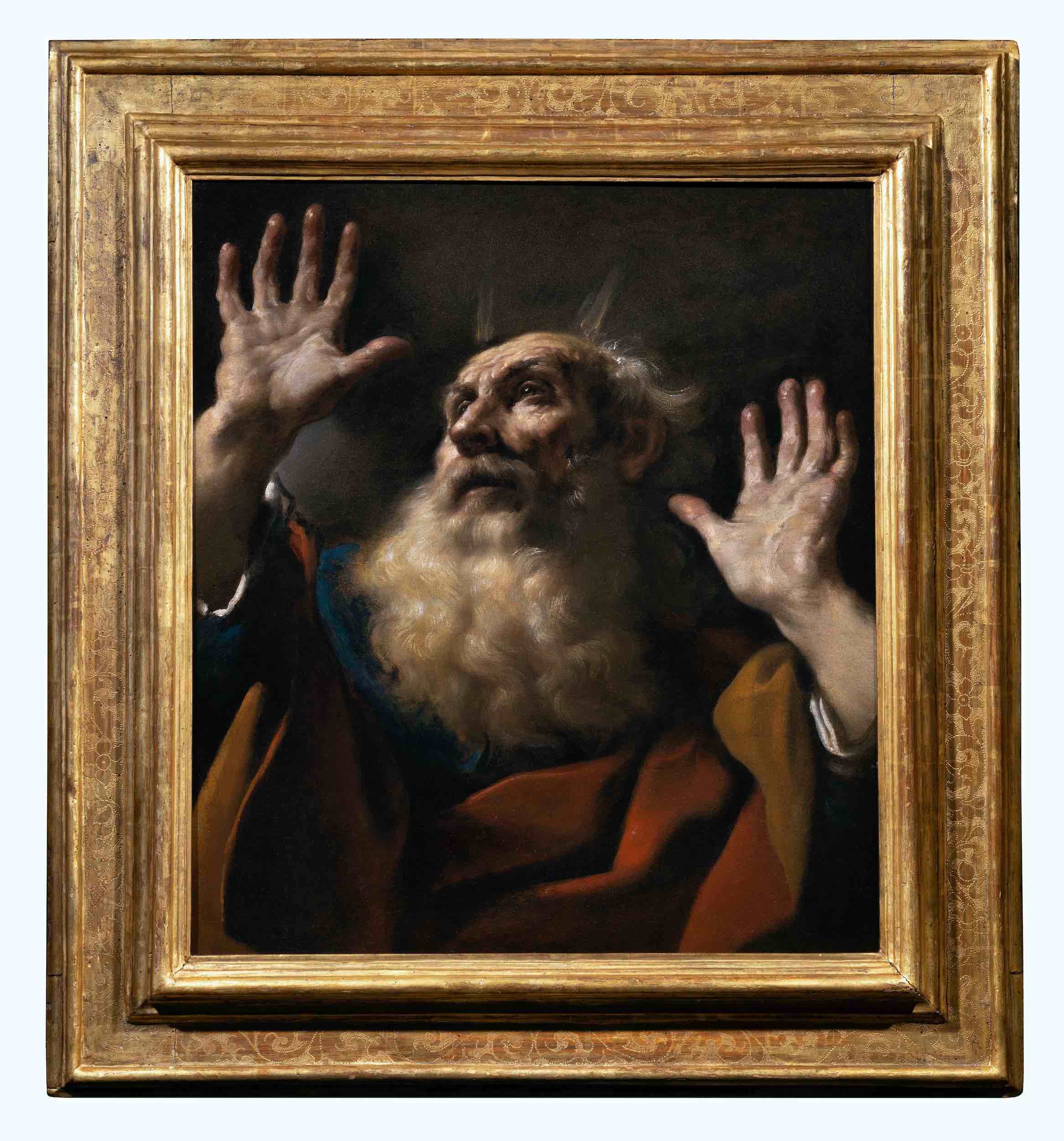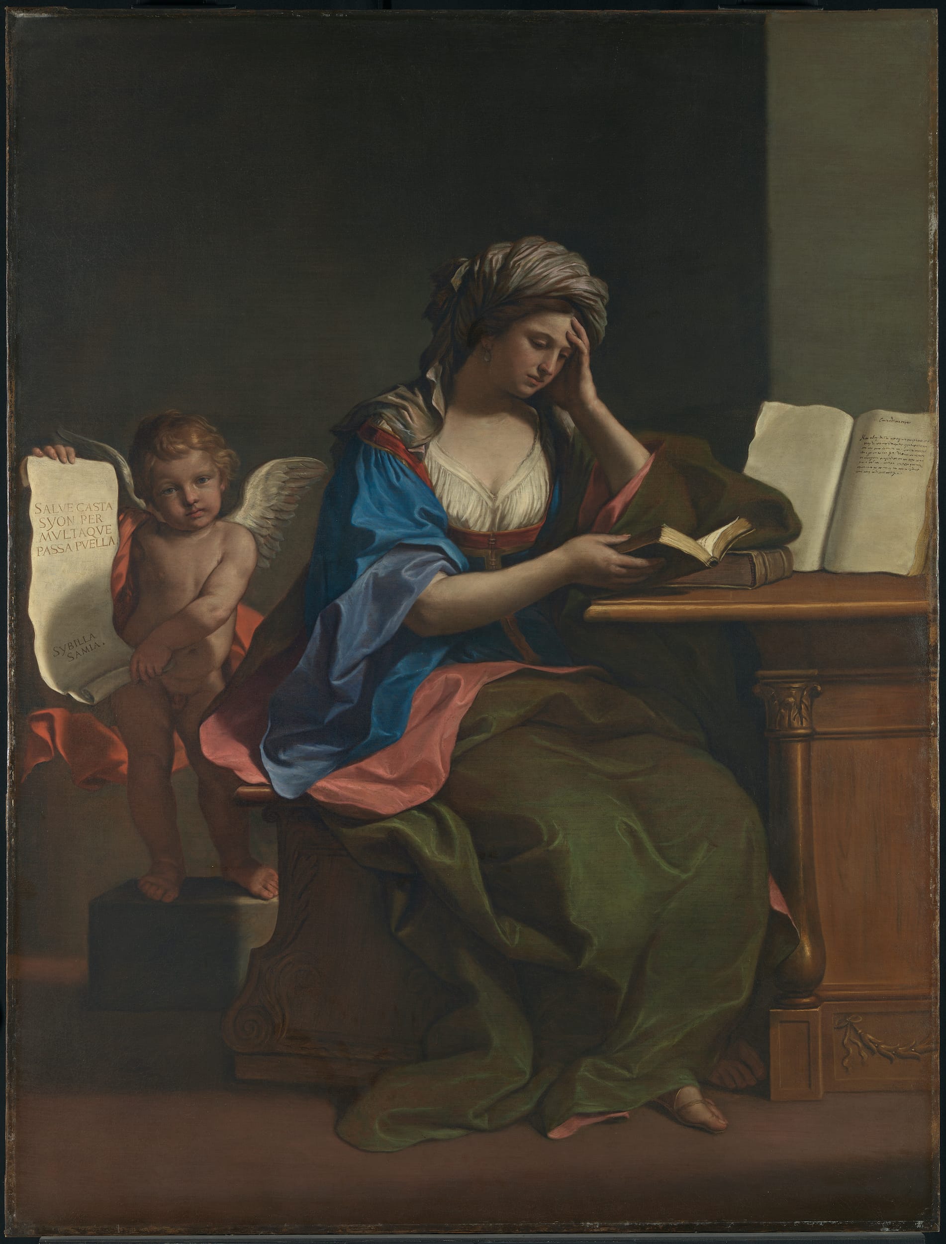 Guercino’s subject matter is biblical. A portrait of King David (1651), alluring and martial — his very sandals are armored — is flanked by two sibyls. David faces us, challengingly, showing his leg rather brazenly as he draws attention to the text of one of his own psalms. The sibyls are in a much more contemplative mood. Once cave-dwelling shriekers and bellowers of prophecy, they seem positively calm. And comely too. David, whose presence keeps them apart, looks kingly, composed, and confident. His beard foams. His turban adds size, moment, and a certain gravitas to his head. The line from the psalm toward which he points, somewhat didactically, raises issues that define the very nature of this show. His words seem to herald the coming of Christ, hundreds of years into the future.