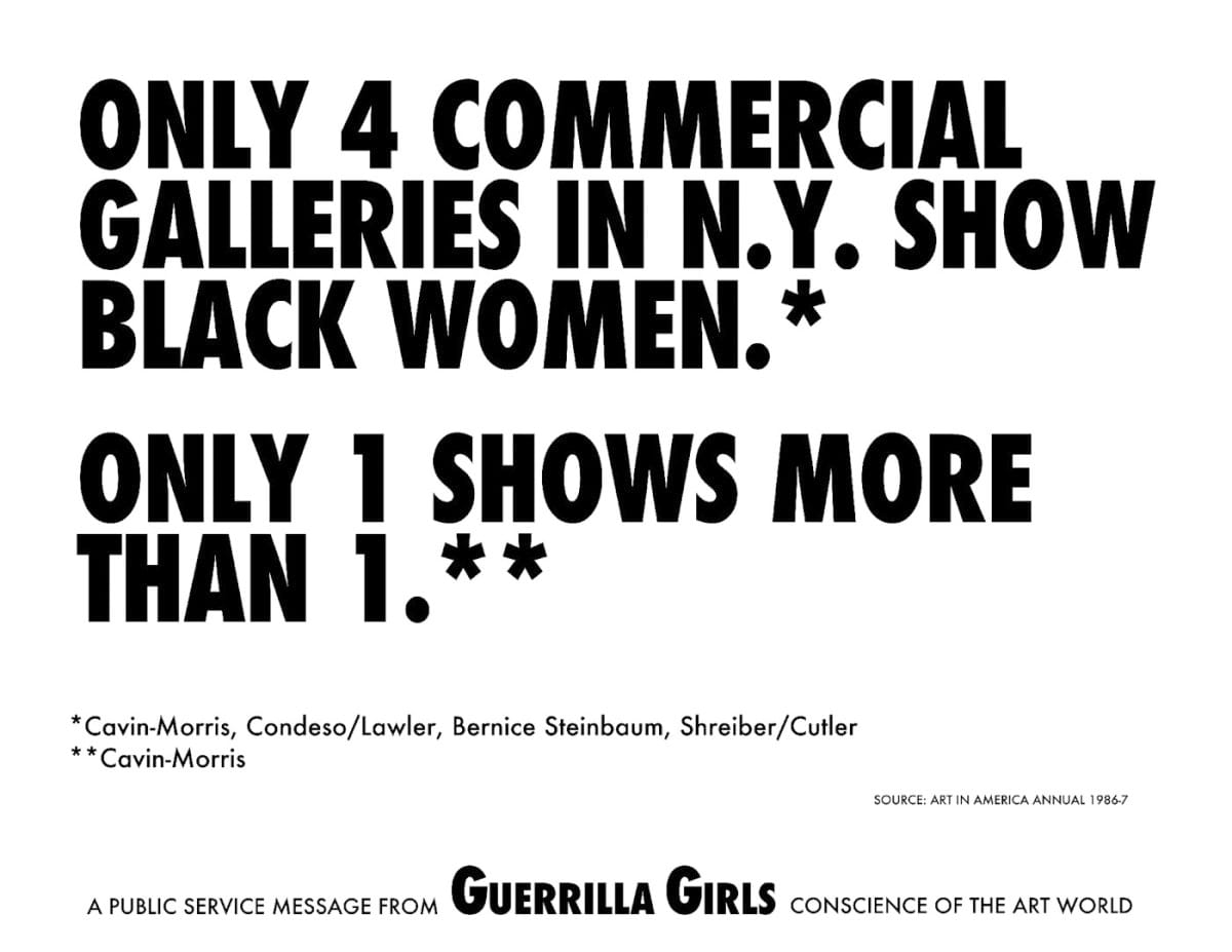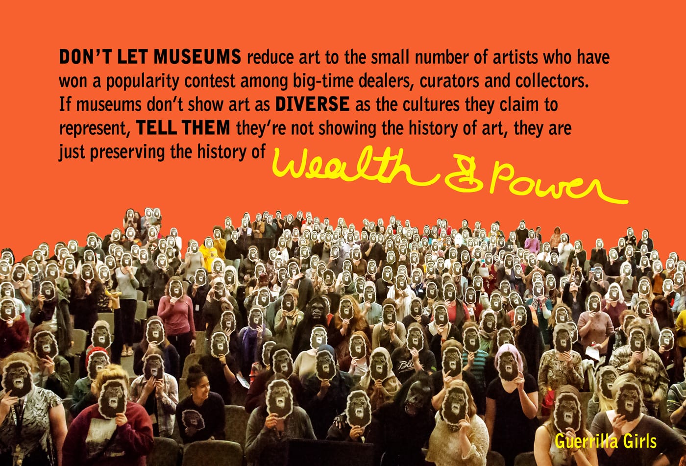 In another (better) universe, this accounting of three decades of advocacy would close on a discussion of how the art world — confronted by cold, hard facts about its inequity, revelations of insider trading among institutional boards and collectors, and mass disenfranchisement of wage workers — rose to the call and did better. But alas, the numbers remain incredibly skewed in the direction of cis white males. This isn't a problem of the book's making, of course; it's a problem of the art world — one that can only be changed by greater demands upon institutions to be more accountable to those they employ, represent, and serve (or by eating the rich, but you didn't hear that from me).