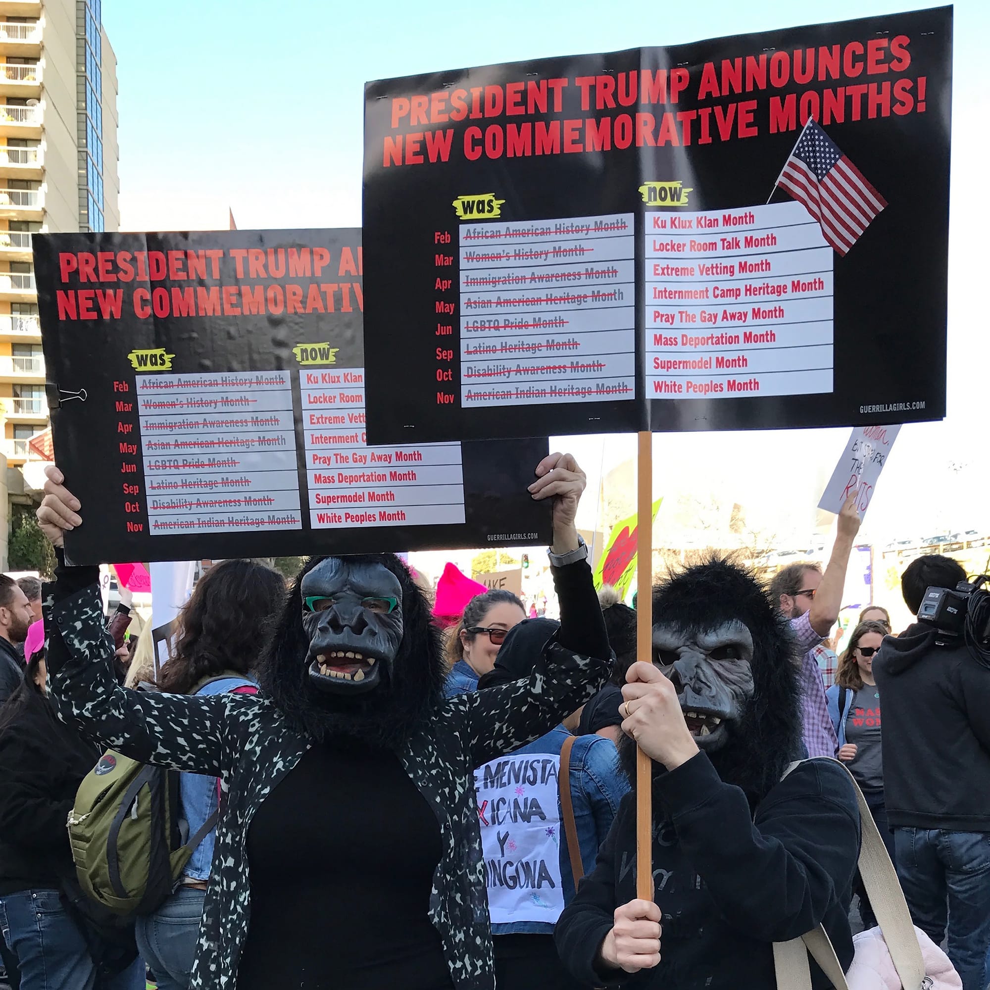 Since they first emerged in 1985 when they began wheat-pasting posters across Lower Manhattan to call out widespread gender inequality in the art world, the Guerrilla Girls have taken on a number of political poster campaigns and projection actions — all while donning their signature gorilla masks — to confront institutional racism, environmental issues, anti-war movements, and conservative politicians including former President George Bush, former Senator Jesse Helms, and former President Donald Trump.