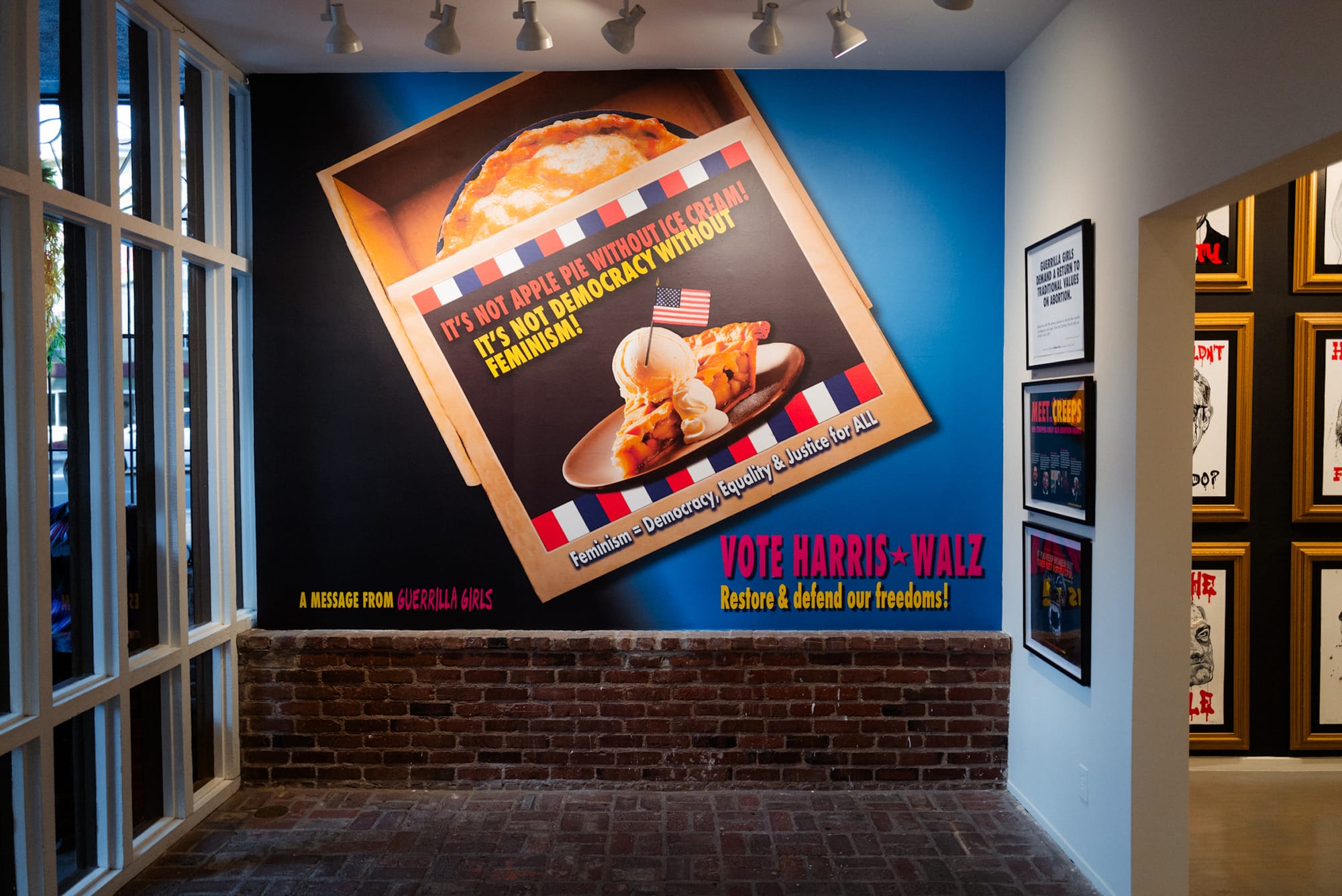 Their latest work expands upon a 2023 poster, “It’s Not Apple Pie Without Ice Cream! It’s Not Democracy Without Feminism!” by superimposing the words onto a slightly ajar pie box that includes the line, “Feminism = Democracy, Equality & Justice for ALL.”