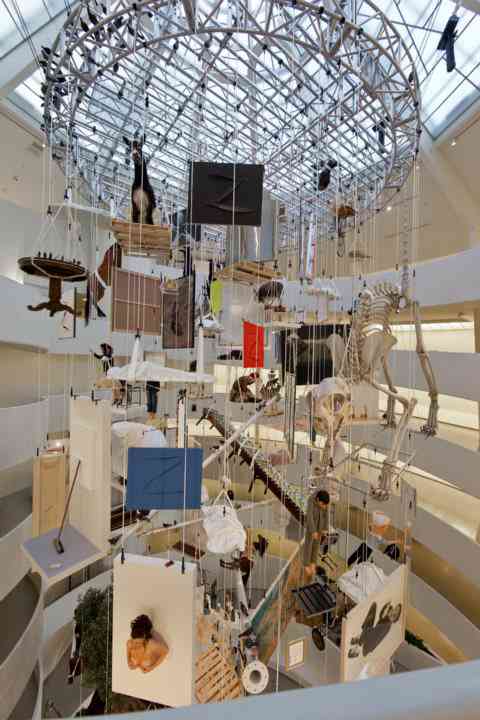 The normally empty atrium of the landmark museum has been filled by a column of 130 of the artist’s works suspended on 90-foot cables. Consider our minds blown.