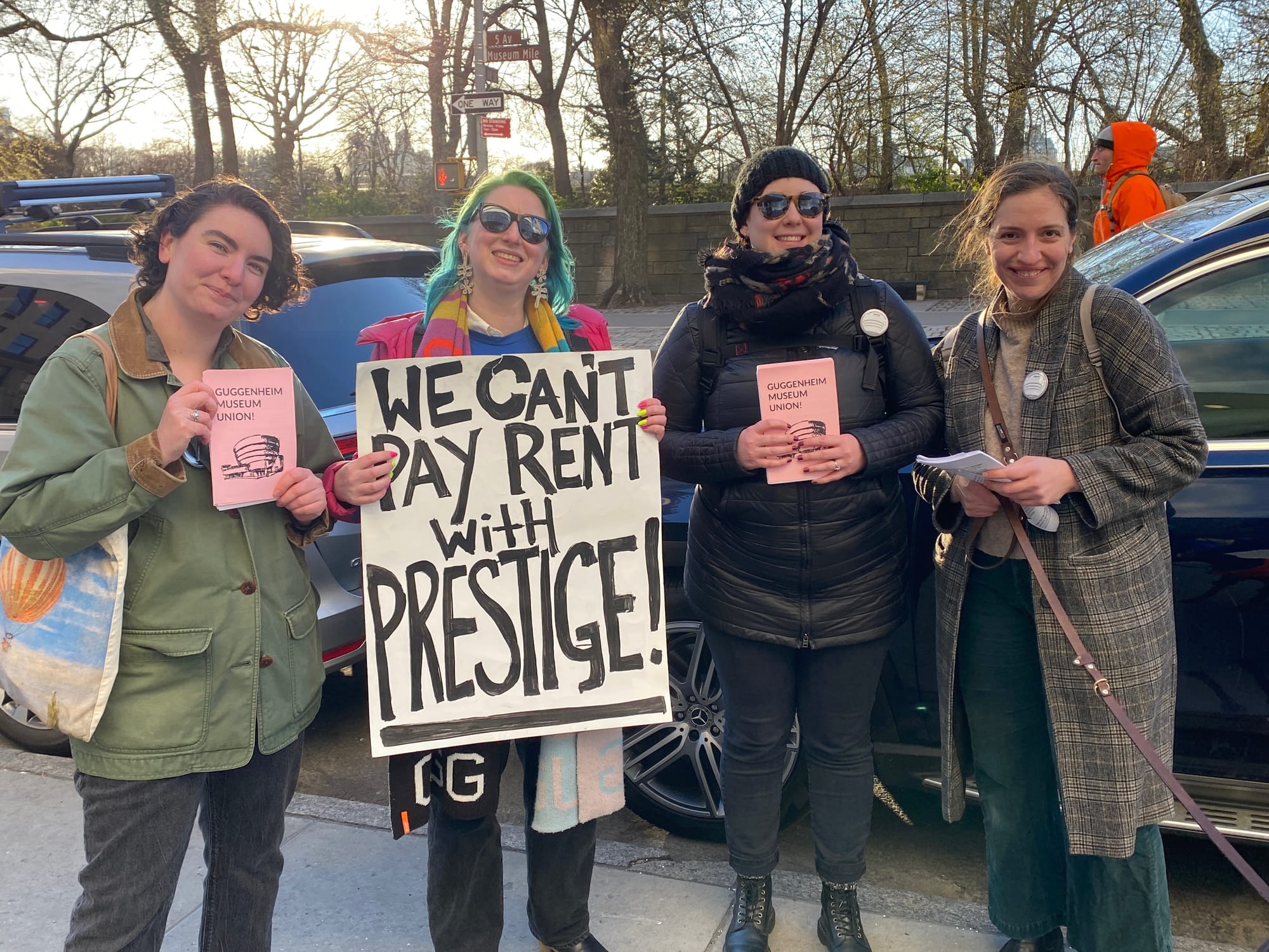 Along Fifth Avenue's Museum Mile and clustered around the crosswalks, union members approached attendees and passersby, handing out leaflets and encouraging drivers to “Honk 4 Fair Wages.” While many breezed by in a rush, some stopped to take the handout and commented they were surprised to hear that Guggenheim staff were unionized. Manager of Visitor Experiences Nicolette Zorn told Hyperallergic that they’ve mostly had a positive reception from visitors and neighborhood residents wanting to learn more about their efforts.