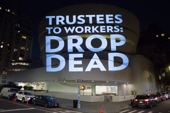 Earlier in September, the artist collectives Artists for Workers and the Illuminator projected messages onto the Guggenheim’s facade in solidarity with the union and workers at Guggenheim Abu Dhabi. The guerrilla projection illuminated the museum’s building with slogans like “Fair Contract,” “Seeking New Management,” and “Open for Exploitation.” The groups held their actions independently of the Guggenheim Union.