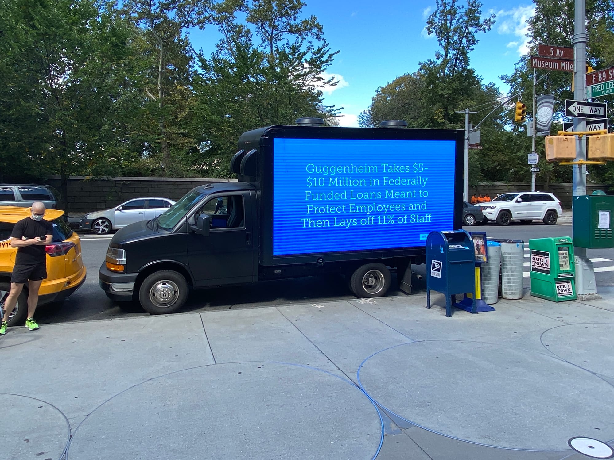 “We Deserve a Better Guggenheim,” read one of the messages on the mobile screen. Others read “Fair Contract Now” and “#DoBetterGuggenehim,” in addition to news clips and facts about the union’s year-long negotiations with the museum, which have yet to culminate in a collective bargaining contract.