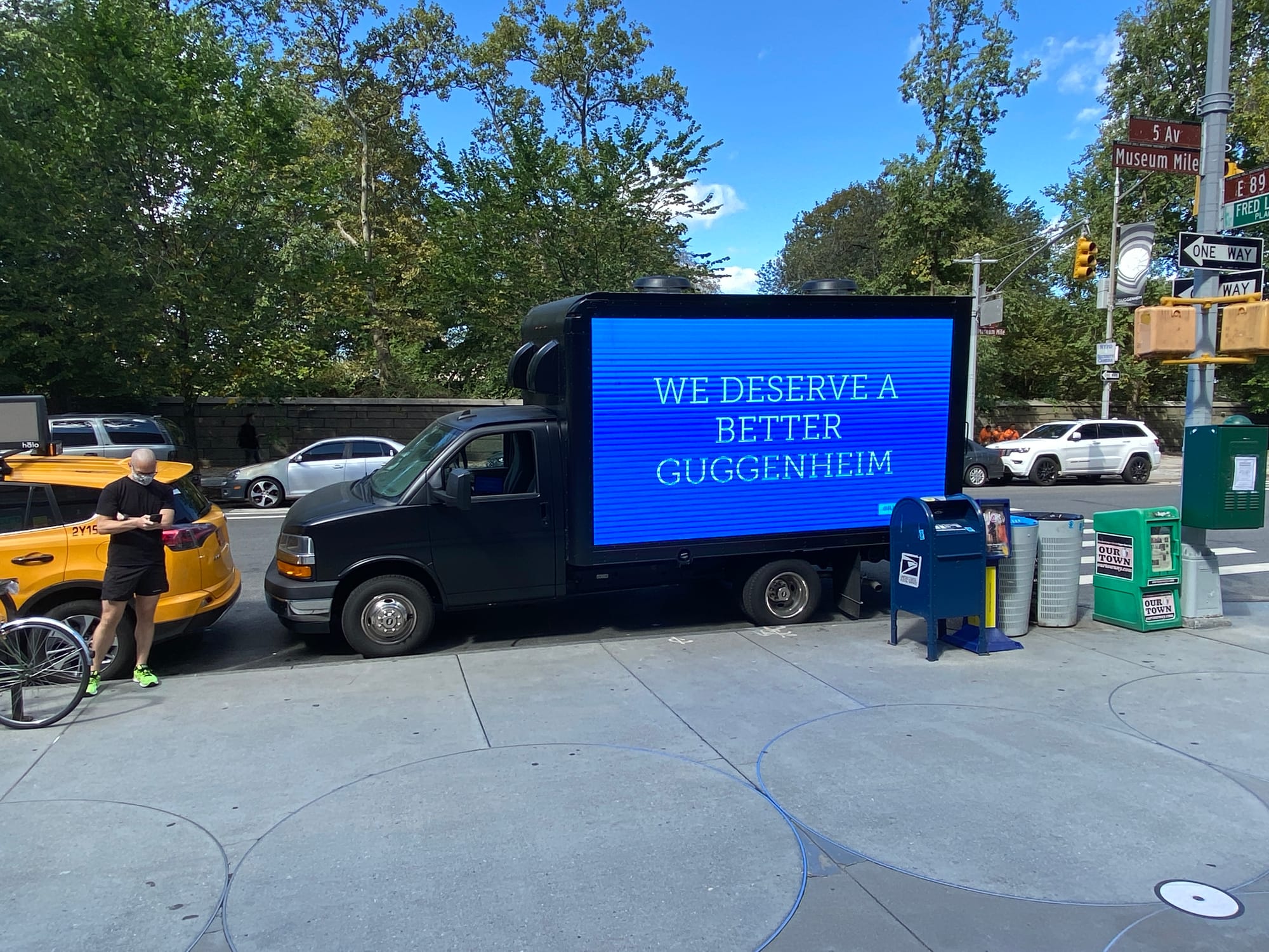 The truck belonged to Local 30, the union representing art handlers and facilities staff at the Guggenheim, who staged a protest outside the museum during its members-only re-opening.