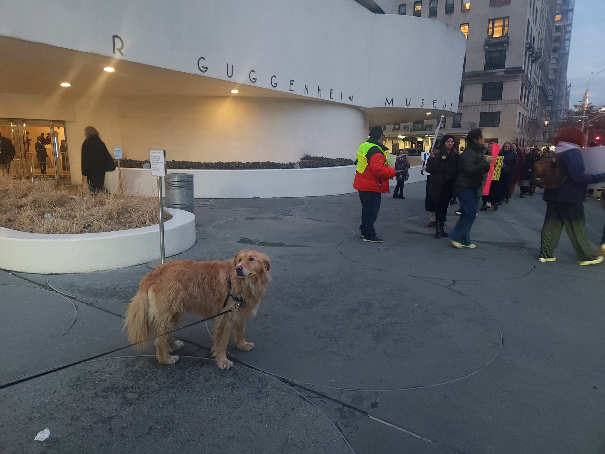 A group of around 30 museum workers and allies picketed outside with signs, chants, and multicolored flyers for event goers and passersby. Leading the charge last night were museum educator Drew Reynolds, chair of the Guggenheim Museum union, and veteran labor organizer Maida Rosenstein of Local 2110 UAW.
