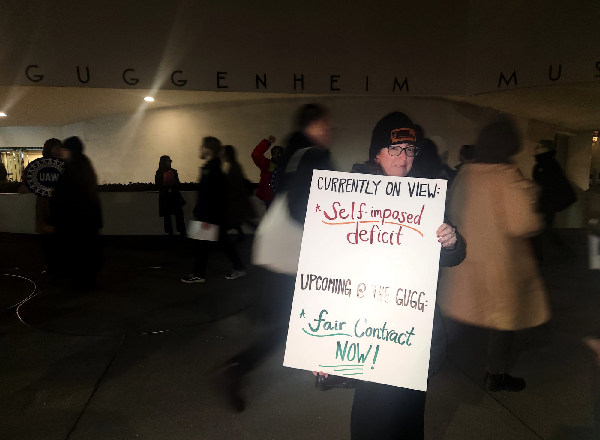 It was a favorably mild-weathered evening in New York yesterday, March 4, when thunderous calls for a fair contract rumbled through the air at the Guggenheim Museum's opening reception for Carol Bove's solo exhibition.