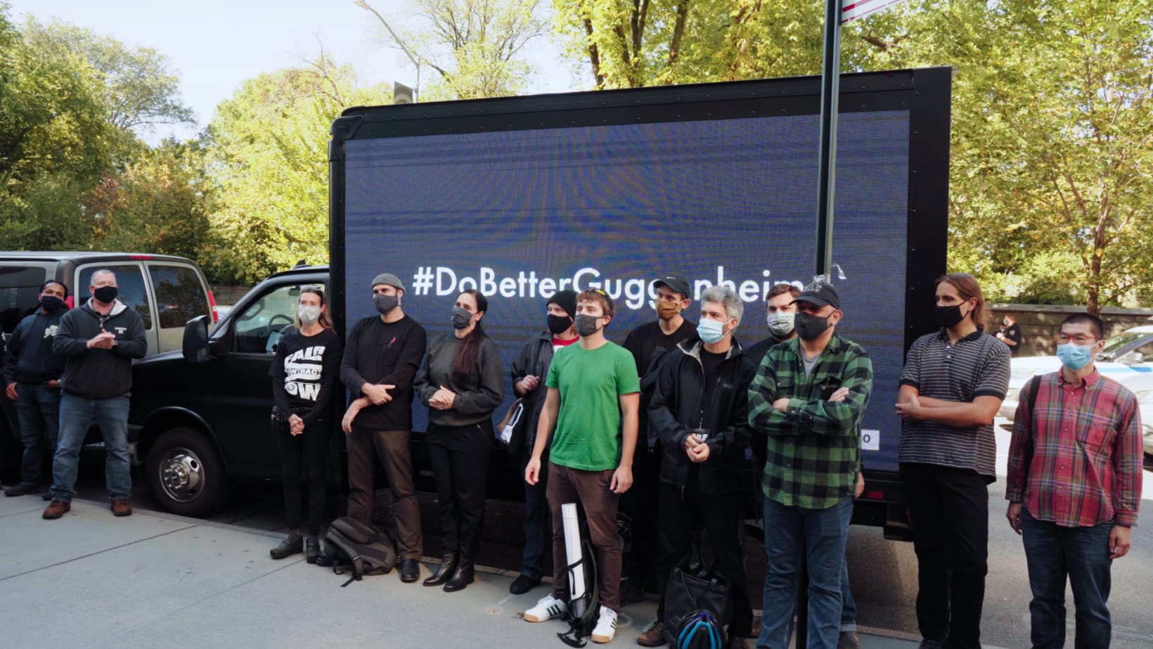 The pandemic has intensified issues at the institution, with the Guggenheim refusing to pay on-call employees for work scheduled before the lockdown and laying off dozens of staff. Other recent protest actions by the Guggenheim Union include using the Illuminator to project damning messages on the museum’s façade.
