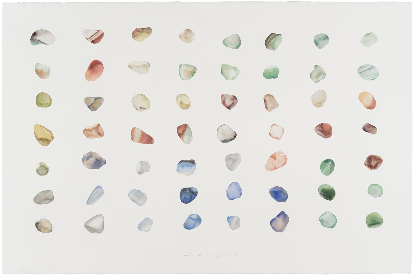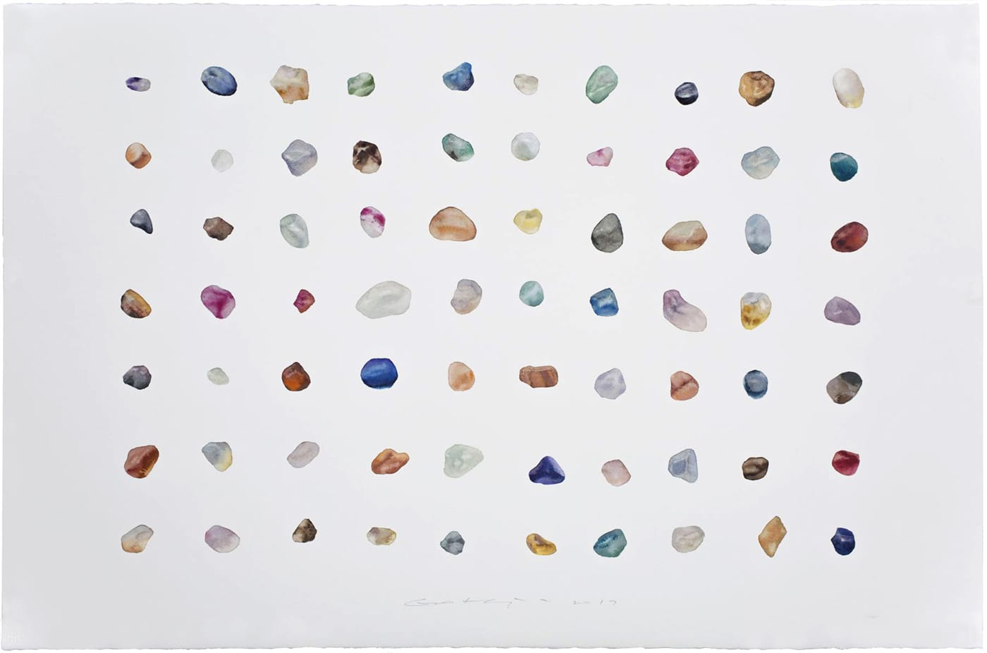 In them, delicate applications of watery pigment give recognizable form to Guo’s subjects, but what looks like scientific precision in his luminous images is not always self-conscious verisimilitude. Instead, Guo allows himself plenty of room in which to interpret his stones and other subjects — to propose the idea of representing such objects even while depicting them with what looks like scientific accuracy. (One of the signature details of his pictures — his use of chalk to outline a form — serves to hold a meniscus of pigment-filled water as it soaks down into his thick, absorbent paper, depositing a dollop of color on its surface.)
