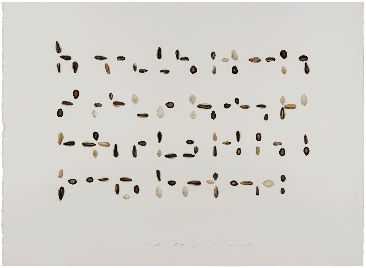 As the exhibition’s title suggests — “pareidolia” refers to the detection of meaningful images in ambiguous or random patterns (think Rorschach inkblot tests) — the act of seeing and how images are perceived are as much Guo’s subjects as the stones, birds, and seeds that he so deftly depicts.
