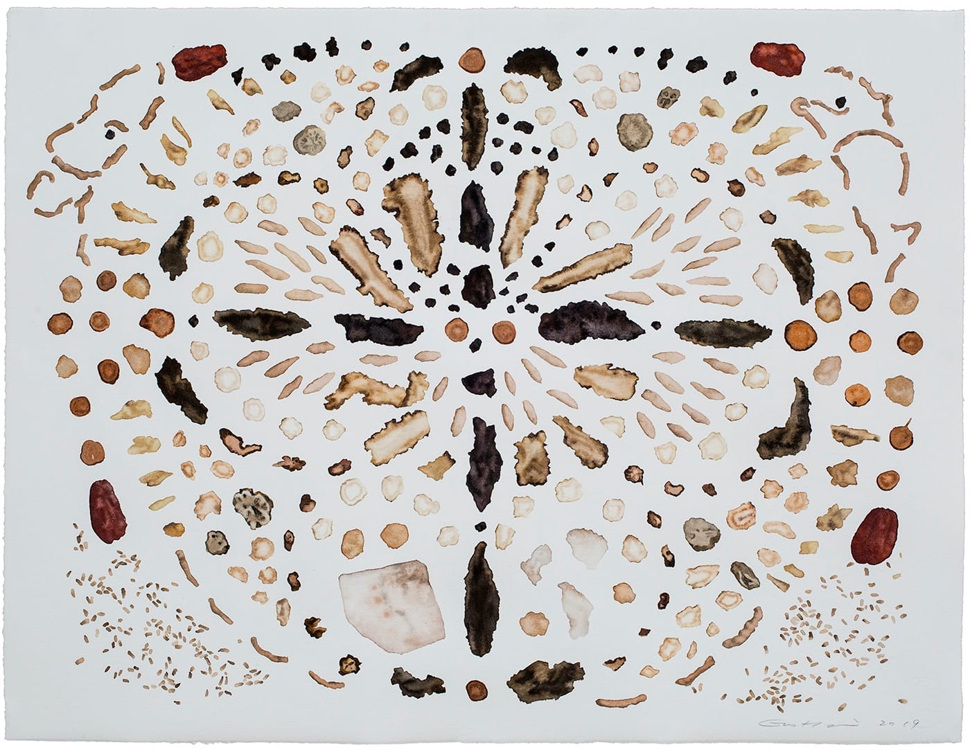The works on view in Pareidolia invite viewers to discern meaningful shapes or patterns in compositions featuring depictions of real or imaginary stones, or seeds, or dried leaves and other ingredients of traditional Chinese herbal remedies. Sometimes, as in “Cosmic Candies No. 2” (2018), Guo lines up his precious subjects — dozens of translucent, colored, glassy stones — in neat, horizontal rows. Elsewhere, as in “Remedies for Sorrow Diagram No. 4 — Spirit-Healing Tea” (2019), a voluminous cloud of colorful flecks representing brown-toned seed pods and other dried ingredients of a curative potion creates an image that can be appreciated as much for its abstraction as for its specific cultural and historical references.