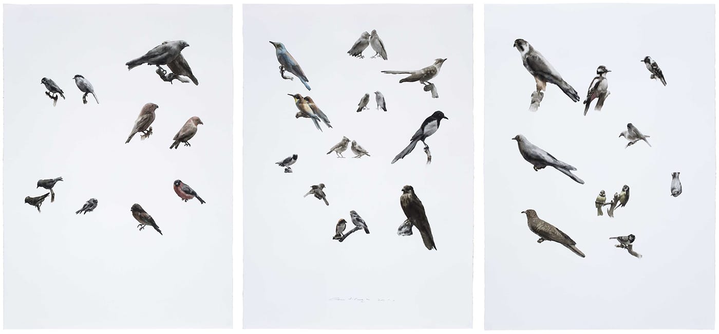 Several years ago, Guo began developing an ongoing series of watercolors titled “Painting is Collecting,” in which he has depicted groupings of mushrooms, birds, colored stones, plant leaves, and other subjects from nature. (Typically, he sets them all against plain, unpainted white backgrounds.)