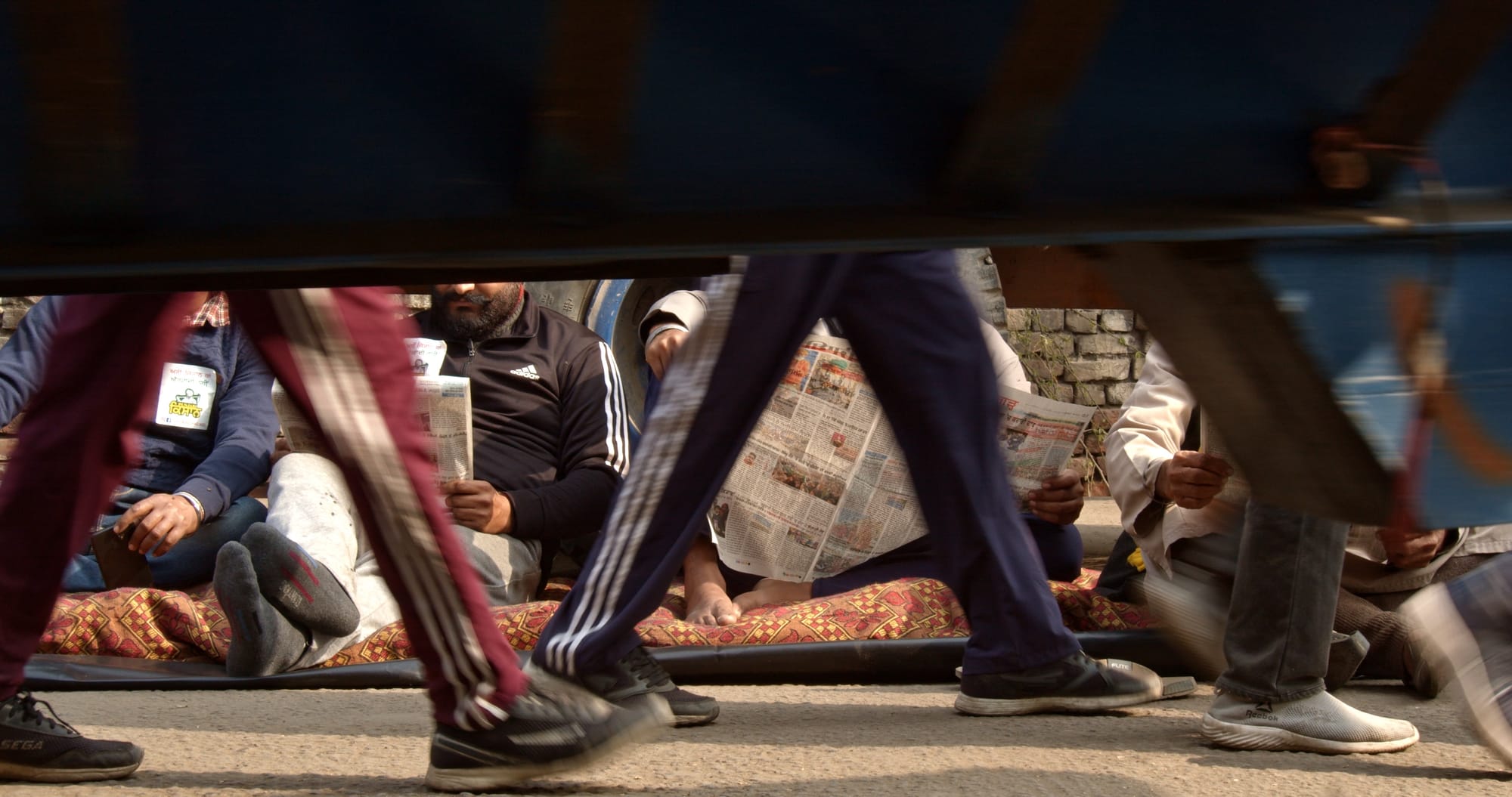 The first part, set in December 2020, captures hoards of farmers who had coalesced on the Delhi-Haryana border, living in tents. The dissemination of Trolley Times, a newsletter started by a group of activists to disband false propaganda dished out by state-controlled media, informs them of the social and political progress of their protest. Here, we see farmers reading it and having conversations among themselves.