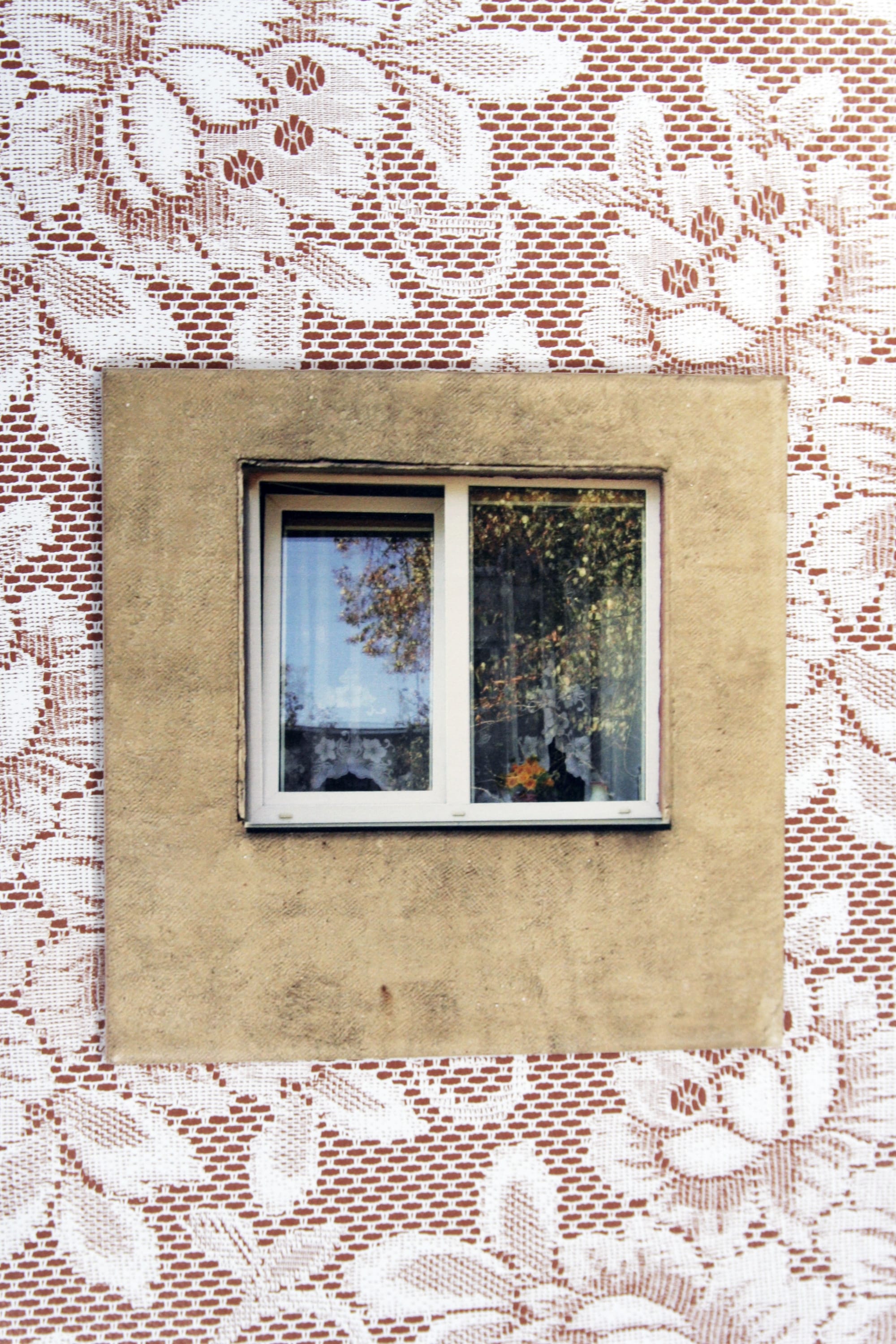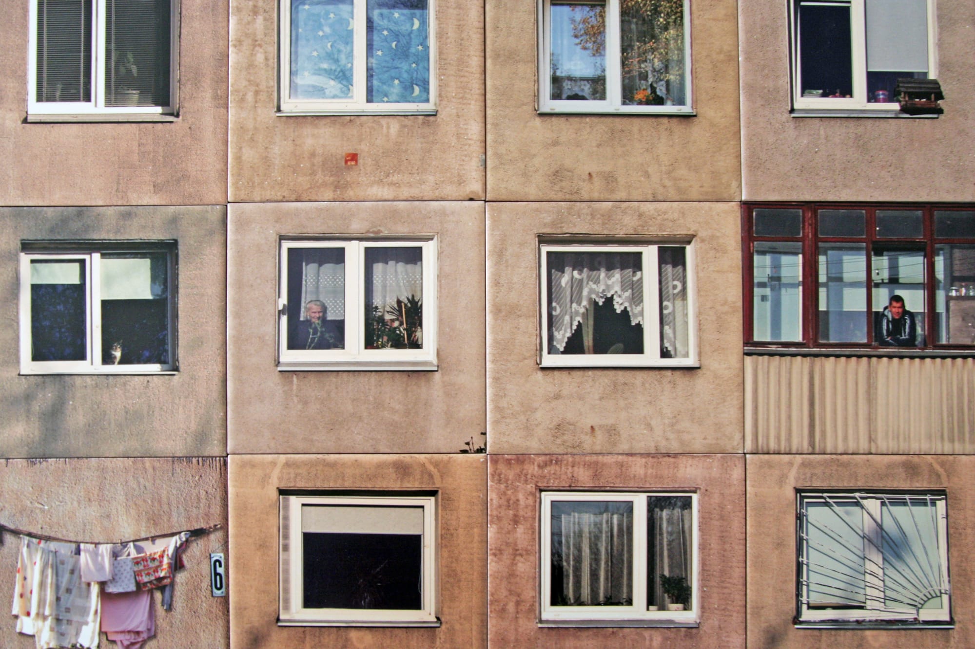 The transformation was fairly simple. Using photographs of apartment block windows in Šimkus’s childhood neighborhood, Gyva Grafika created stickers to put on top of the tiles. Each tile became a concrete panel with a window, or depicting laundry hanging to dry; lined up and stacked, the tiles make the wall look just like a panel building. Every once in a while, you’ll see faces (and cats) looking out the windows, “accidentally shot with a camera,” Šimkus said, “[but] they are an inseparable part of the façade.”