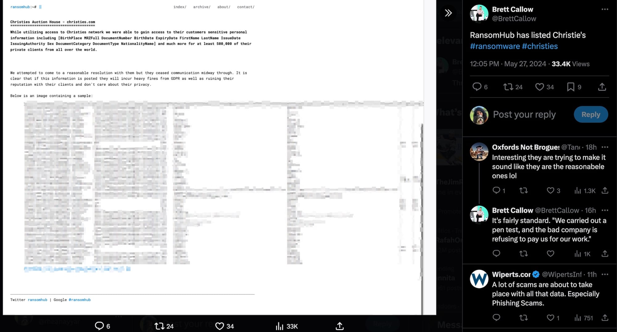 On Monday, May 27, RansomHub took responsibility for the attack, according to the New York Times, and claimed to have retrieved personal information from half a million Christie's clients. In a statement reportedly published on the so-called dark web, the group shared a screen-captured snippet of client information including full names, birthdates, sex, and nationality as proof, threatening to release all information unless the auction house paid up.