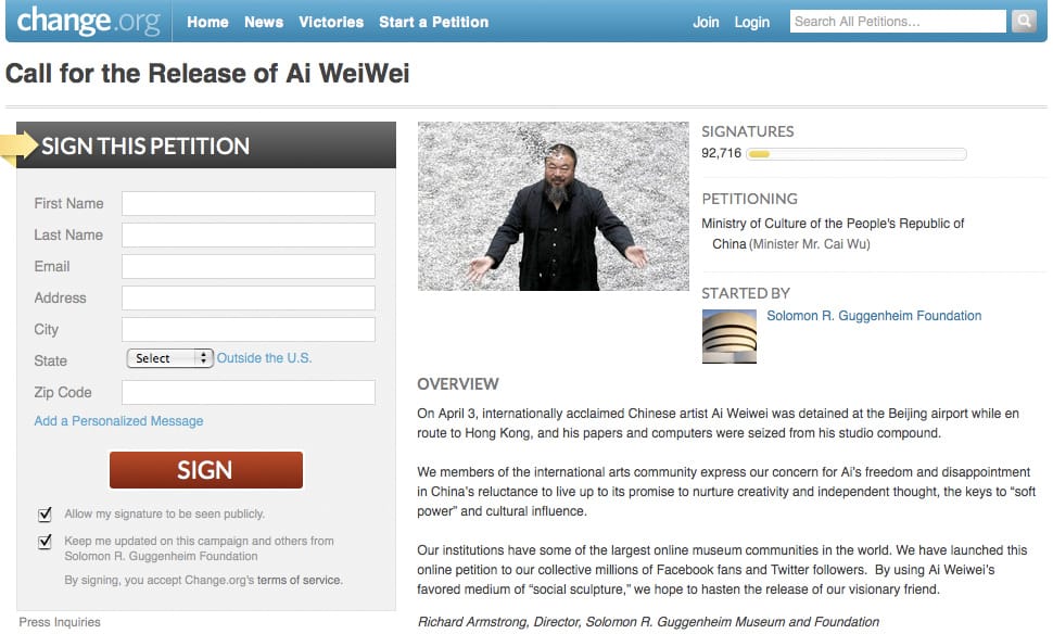 The targeting of the Ai Weiwei petition is a clear sign that controversy hasn’t cooled off over the artist’s arrest. The story continues to develop.