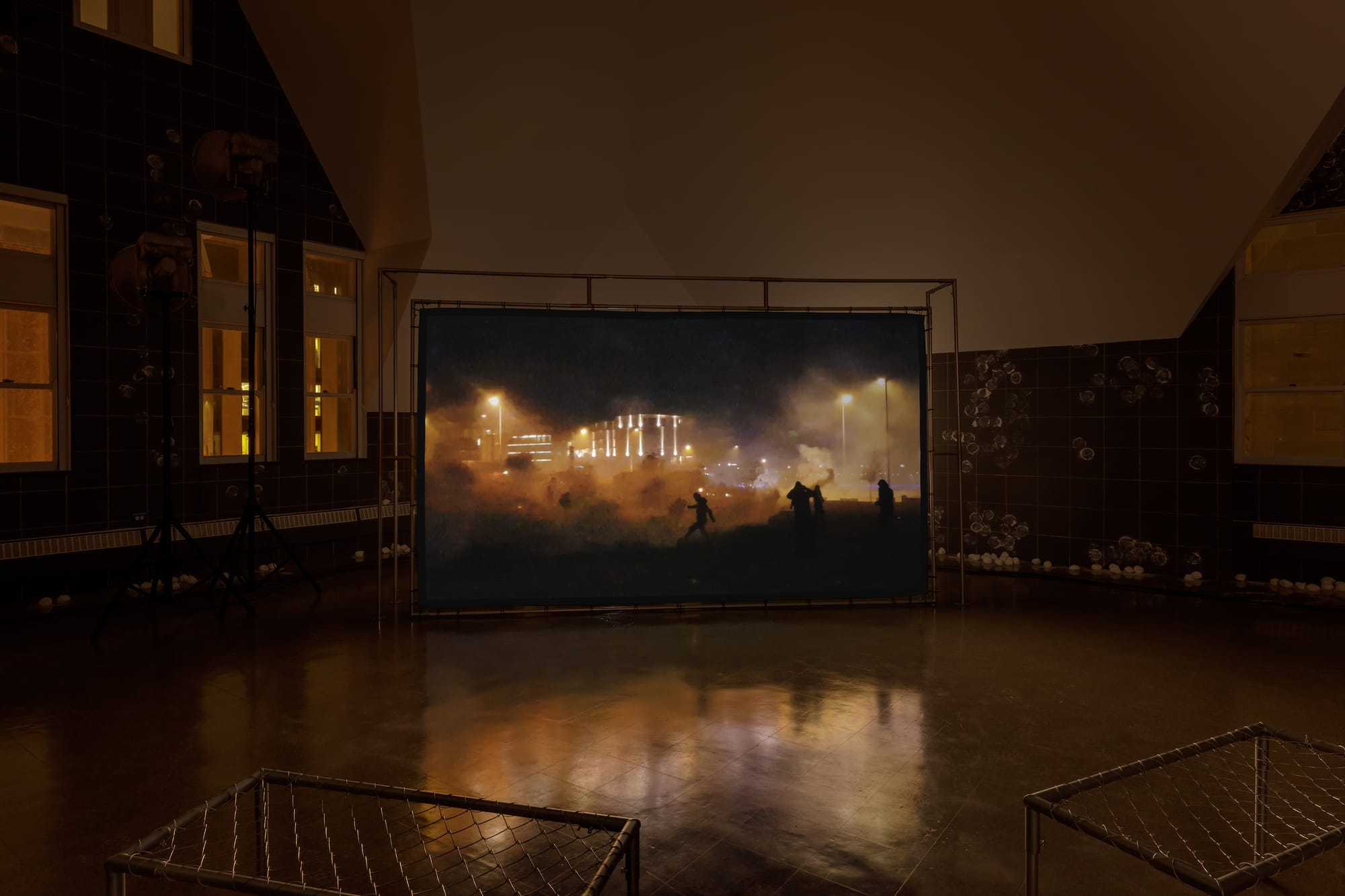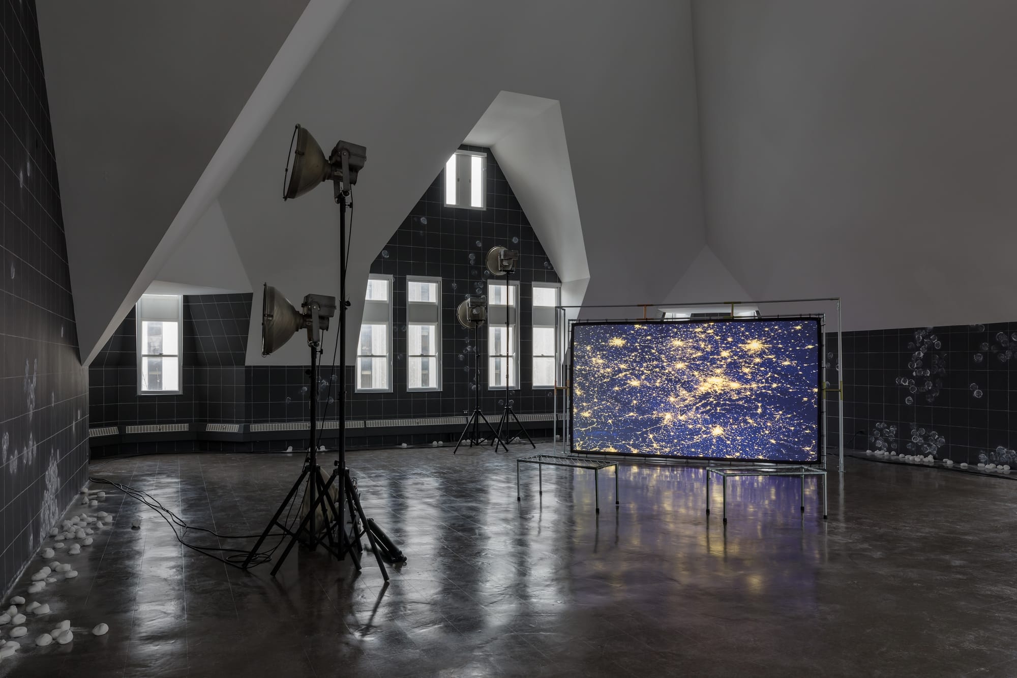 CHICAGO — If the title of Haig Aivazian’s exhibition isn’t intended to refer to Kanye’s decade-old hit, the connection is nonetheless appreciated. All of the Lights fills the chapel-like gallery of the Renaissance Society, where the Beirut-based artist presents two single-channel videos. The surroundings are dramatic; black walls awash with the white light of high-powered, steel-girded halogens. A chalked grid is traced over these vertical surfaces, its lines interrupted by the circular imprints made by thrown sacks of white powder, now left lining the gallery floor. Overlit and strewn with audio-visual detritus, the space appears like an abandoned concert stage after a riot.