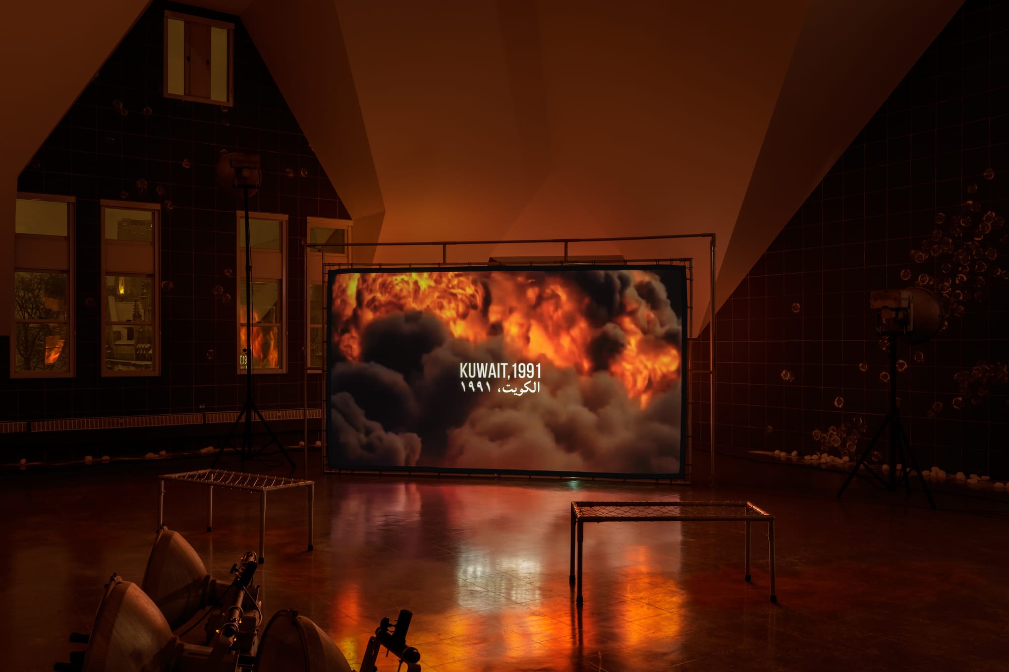 Like the visual artist Arthur Jafa (who has himself worked with Kanye West), Aivazian masterfully manipulates found video footage and sound, producing supercuts with harrowing, evocative juxtapositions. In Prometheus (2019), images of the Gulf War stream alongside excerpts from the 1992 Barcelona Olympics. A towering, mechanical figure of the Titan god speeds across a stadium in its opening ceremony, chased by sparks and surrounded by dancers clad in flame costumes. The civilization myth of fire’s warmth and light is disrupted by scenes of oil fields ablaze in Kuwait and news footage of US bombers raining ordnance over the Persian Gulf.
