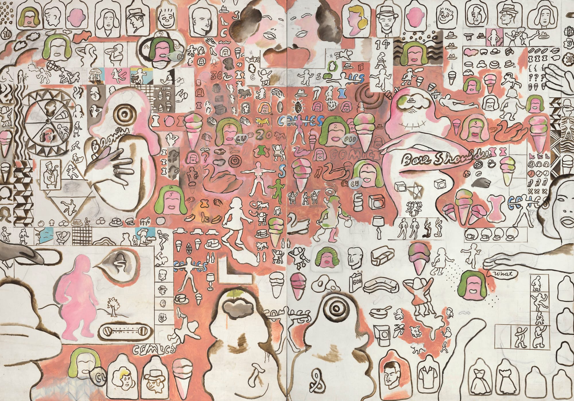 Suellen Rocca’s works, such as “Bare Shoulder Beauty” and “Curly Head” (both 1966), incorporate text that echoes advertising copy, while dividing the picture plane into strips and panels of near-narrative image sequences reminiscent of comics strips. In these works, as in the larger and more ambitious “Suellen’s Corness Painting” (1967), human figures, as well as stockings, rings, and palm trees, appear in outline, some framed in ragged squares, like postage stamps. In other works, such as “Game” (1966–67), human figures drawn in outline are brightly colored or surrounded by radiating lines, in a manner later made famous by Keith Haring.