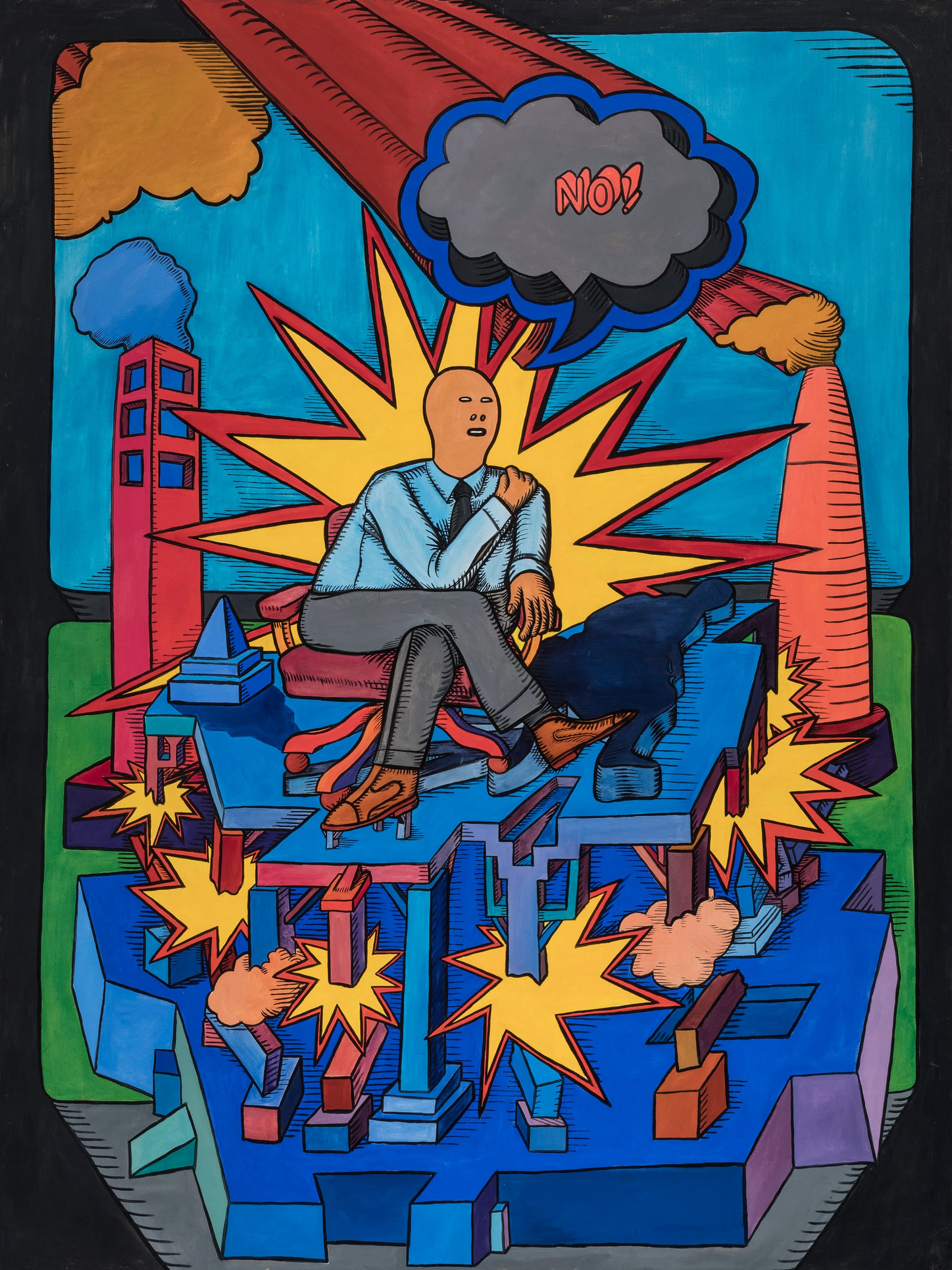 The works of Art Green and Karl Wirsum express the era’s growing sense of crisis more directly. Green’s magnificent “Consider the Options, Examine the Facts, Apply the Logic” (1965) is the first work to confront the viewer entering the exhibition, and it makes a powerful impression. Large by the standards of the Hairy Who, its central figure — a man in a blue Oxford shirt and tie — sits in an office chair atop a complicated structure that is being destroyed by bright yellow, cartoonish explosions. He is framed by a similar explosion, and flanked by what appear to be a smoking skyscraper and factory chimney. Above him is a speech bubble bearing the single, emphatic word, “No!”