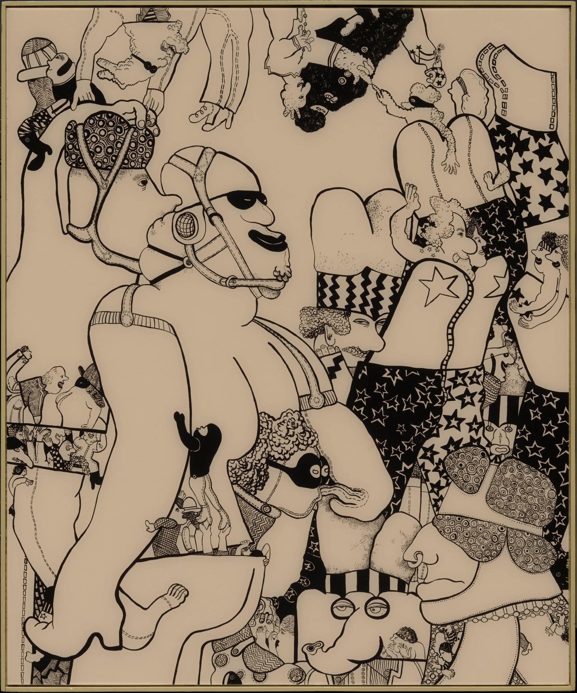 Gladys Nilsson’s canvases are crowded with rounded and inflated figures, reminiscent of Fernando Botero’s, that seem to push outward, demanding ever more space for themselves. Her exquisite skill as a colorist is evident even when she limits her palette to black, white, and one or two other colors, as in her Plexiglass works. Hers is by far the most joyful art of the group.
